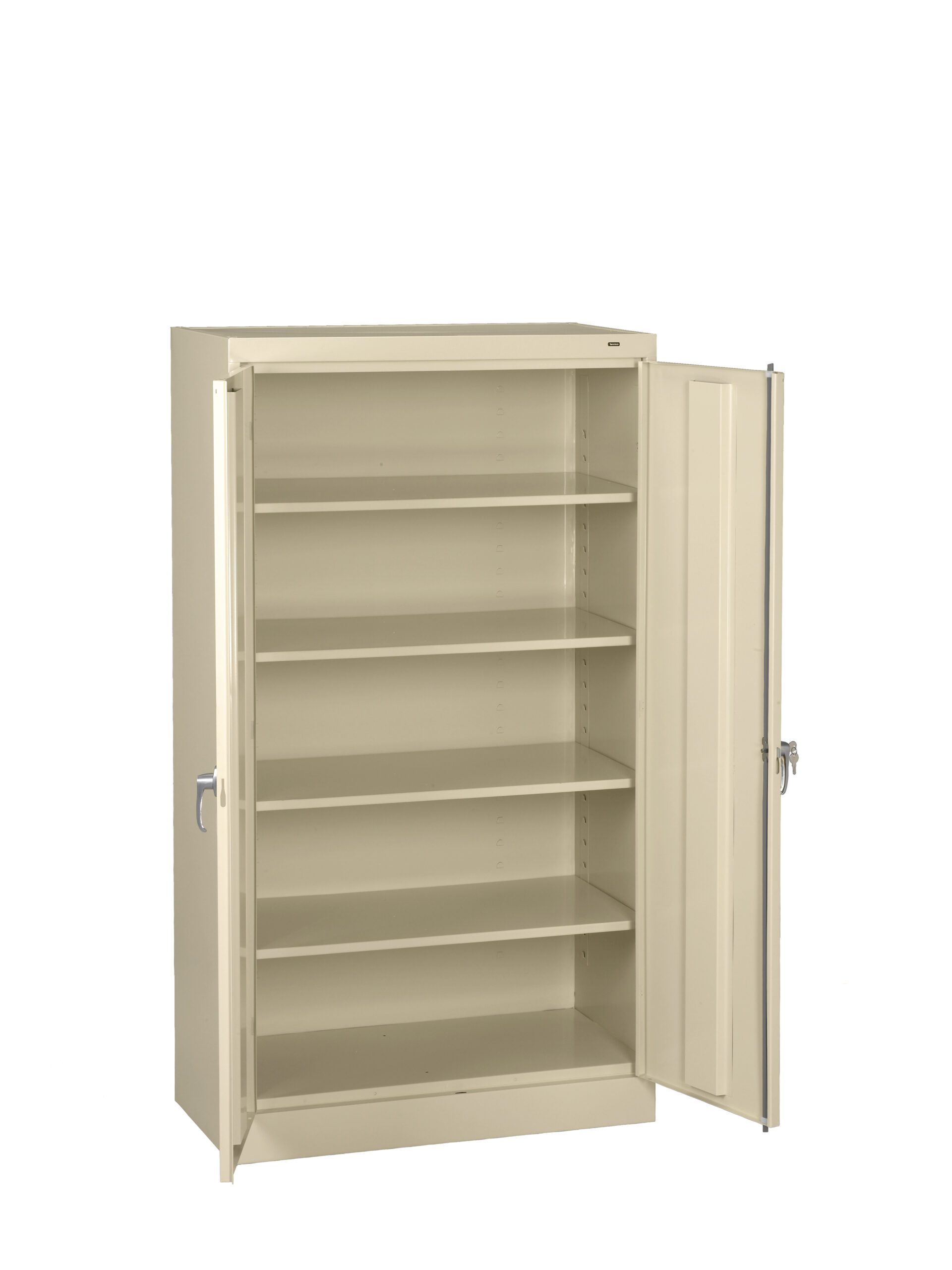 Standard cabinets are built with premium quality steel and reinforced doors for long-term performance at an attractive price. Two brushed chrome handles. Right handle uses three-point keyed locking to secure both doors. Punched lances in back facilitate ventilation. Shelves adjust in 2″ increments without tools. Integrated shelf support tabs secure shelves tightly to cabinet without clips or added parts. Raised base keeps contents out of harm’s way from cleaning liquids.