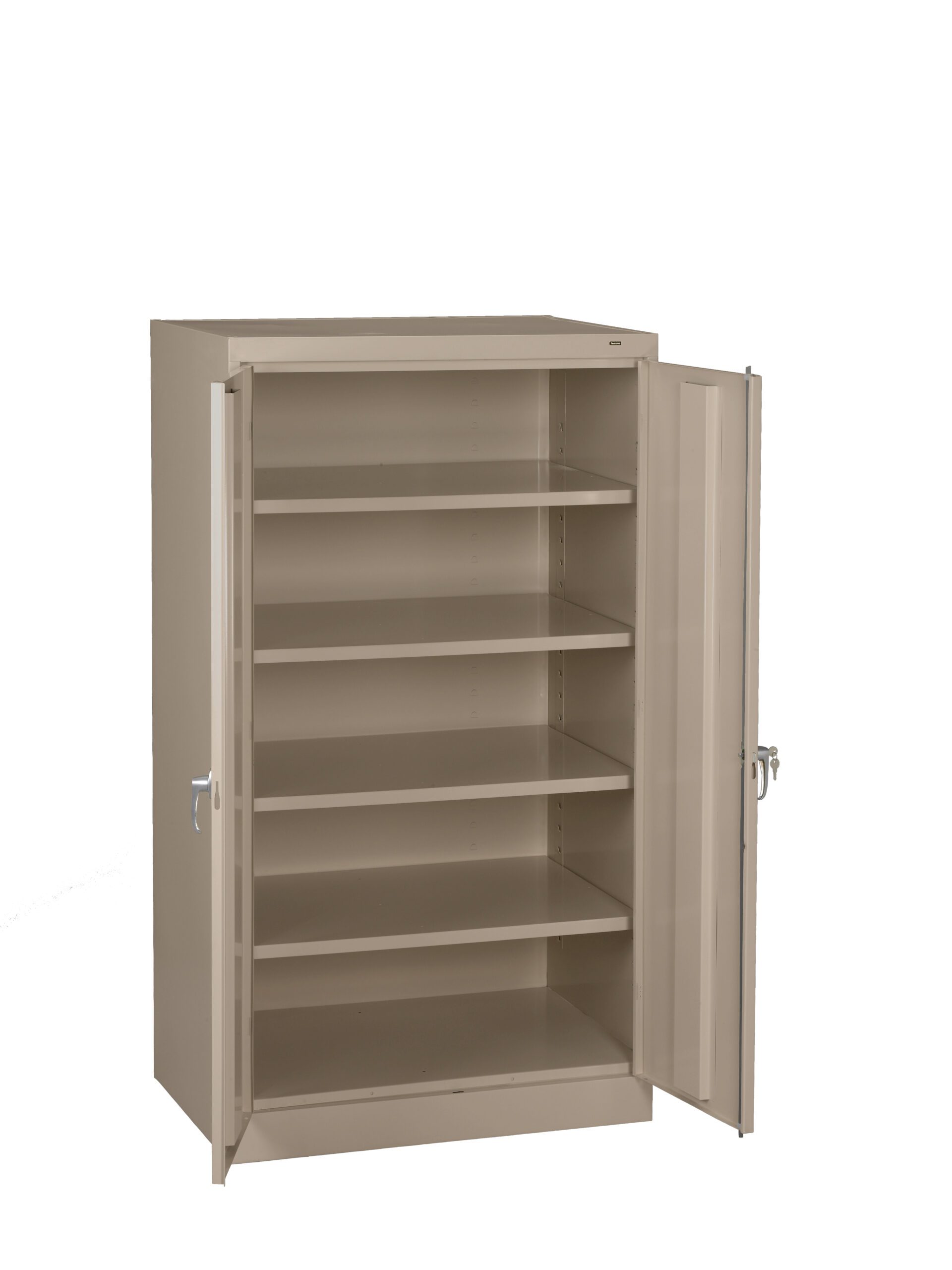Standard cabinets are built with premium quality steel and reinforced doors for long-term performance at an attractive price. Two brushed chrome handles. Right handle uses three-point keyed locking to secure both doors. Punched lances in back facilitate ventilation. Shelves adjust in 2″ increments without tools. Integrated shelf support tabs secure shelves tightly to cabinet without clips or added parts. Raised base keeps contents out of harm’s way from cleaning liquids.