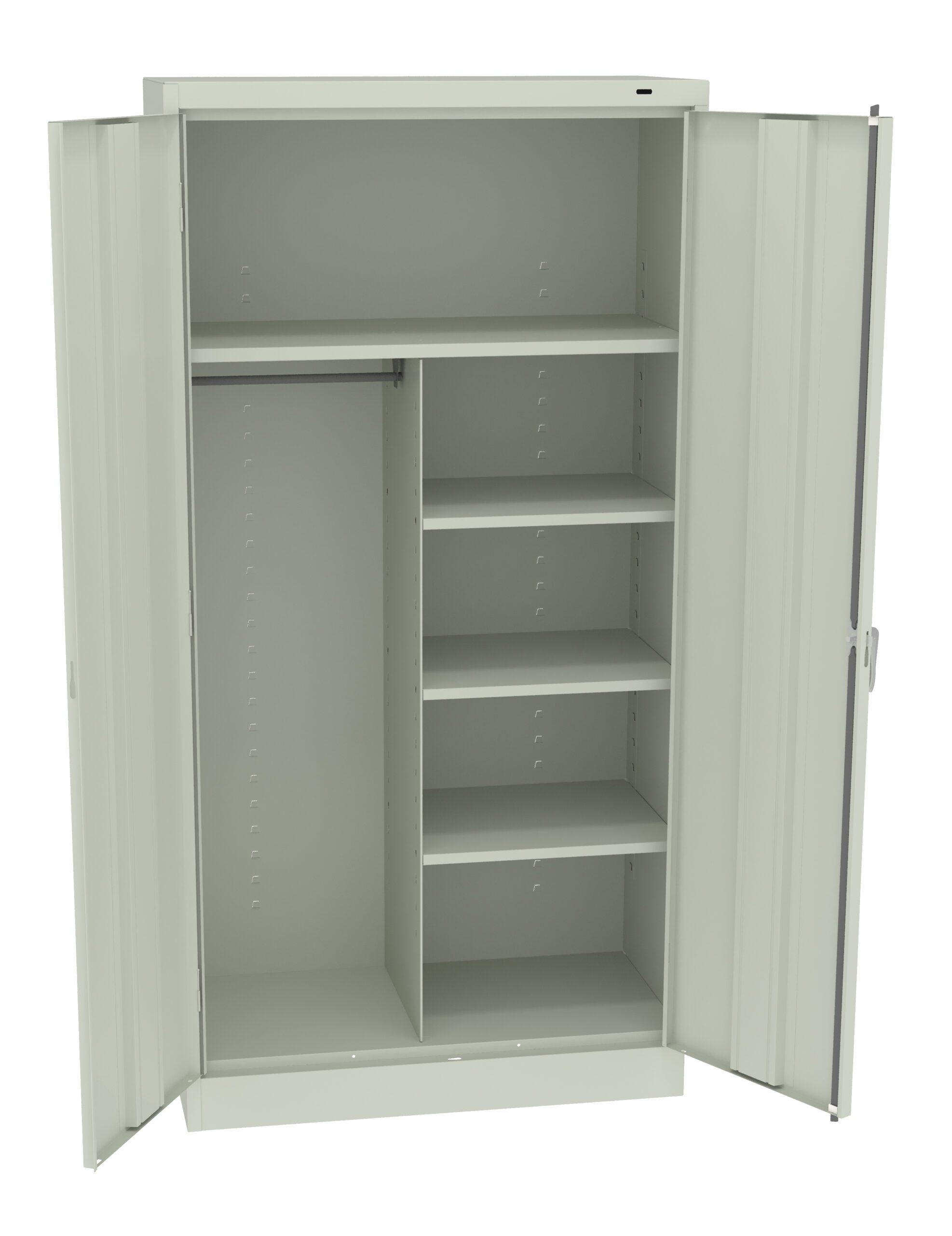 Standard cabinets are built with premium quality steel and reinforced doors for long-term performance at an attractive price. Polished chrome handle uses three-point keyed locking to lock both doors. Punched lances in back facilitate ventilation. Shelves adjust in 2″ increments without tools. Integrated shelf support tabs secure shelves tightly to cabinet without clips or added parts. Raised base keeps contents out of harm’s way from cleaning liquids.