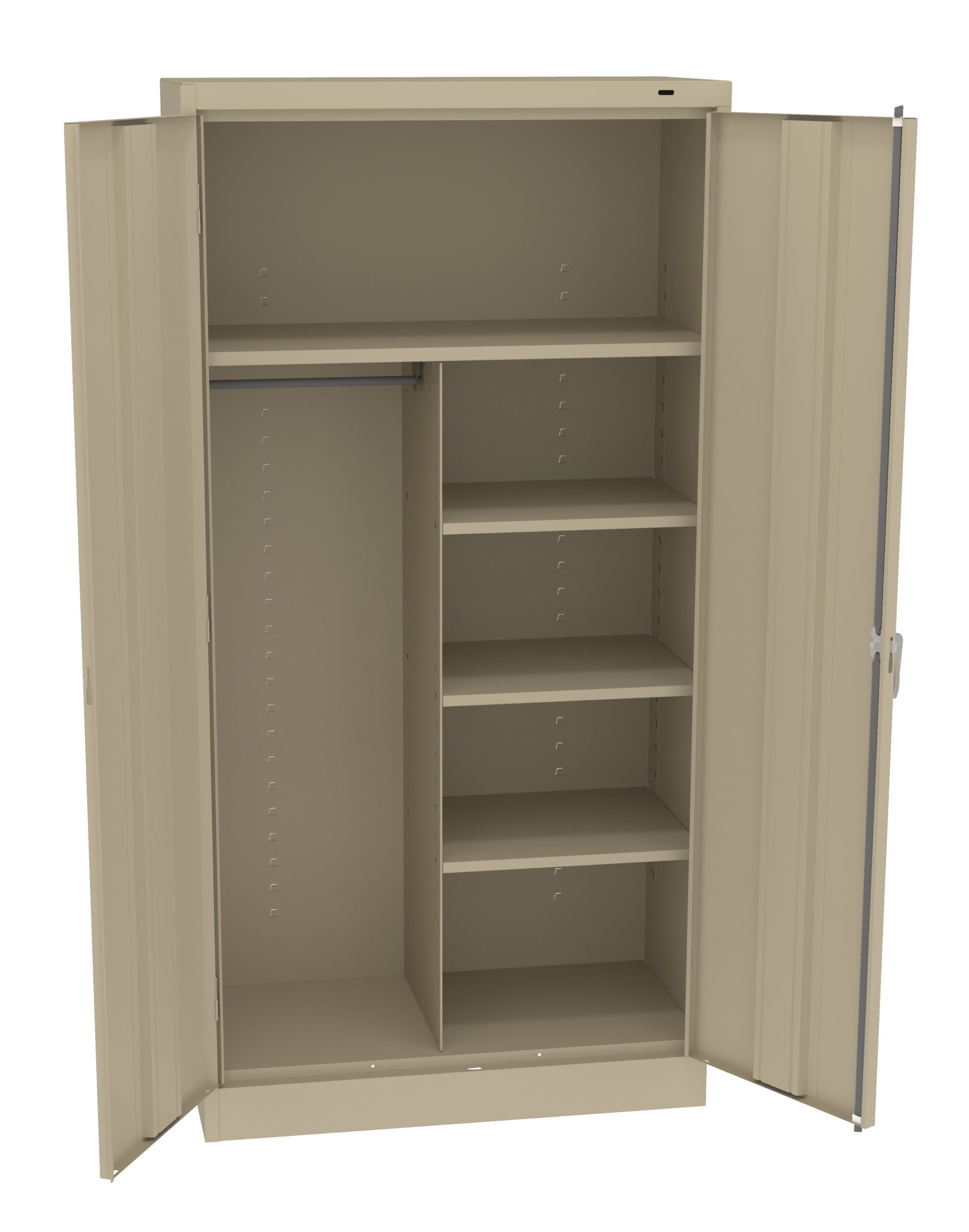 Standard cabinets are built with premium quality steel and reinforced doors for long-term performance at an attractive price. Polished chrome handle uses three-point keyed locking to lock both doors. Punched lances in back facilitate ventilation. Shelves adjust in 2″ increments without tools. Integrated shelf support tabs secure shelves tightly to cabinet without clips or added parts. Raised base keeps contents out of harm’s way from cleaning liquids.