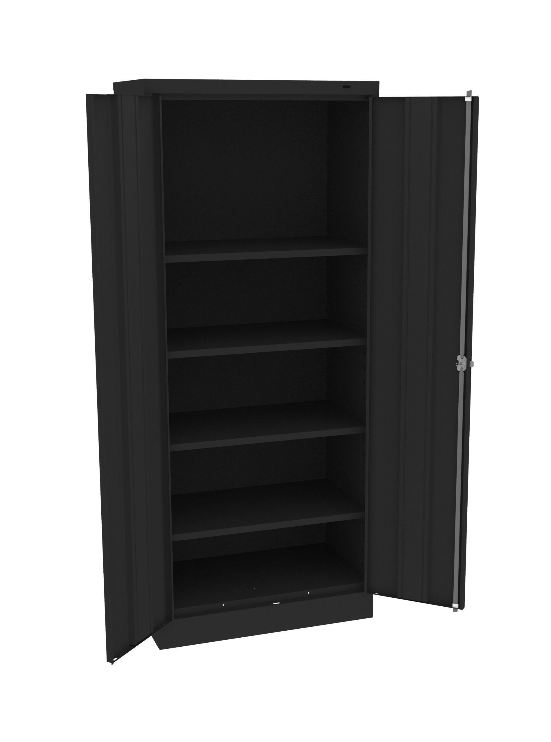 Standard cabinets are built with premium quality steel and reinforced doors for long-term performance at an attractive price. Polished chrome handle uses three-point keyed locking to lock both doors. Punched lances in back facilitate ventilation. Shelves adjust in 2″ increments without tools. Integrated shelf support tabs secure shelves tightly to cabinet without clips or added parts. Raised base keeps contents out of harm’s way from cleaning liquids.