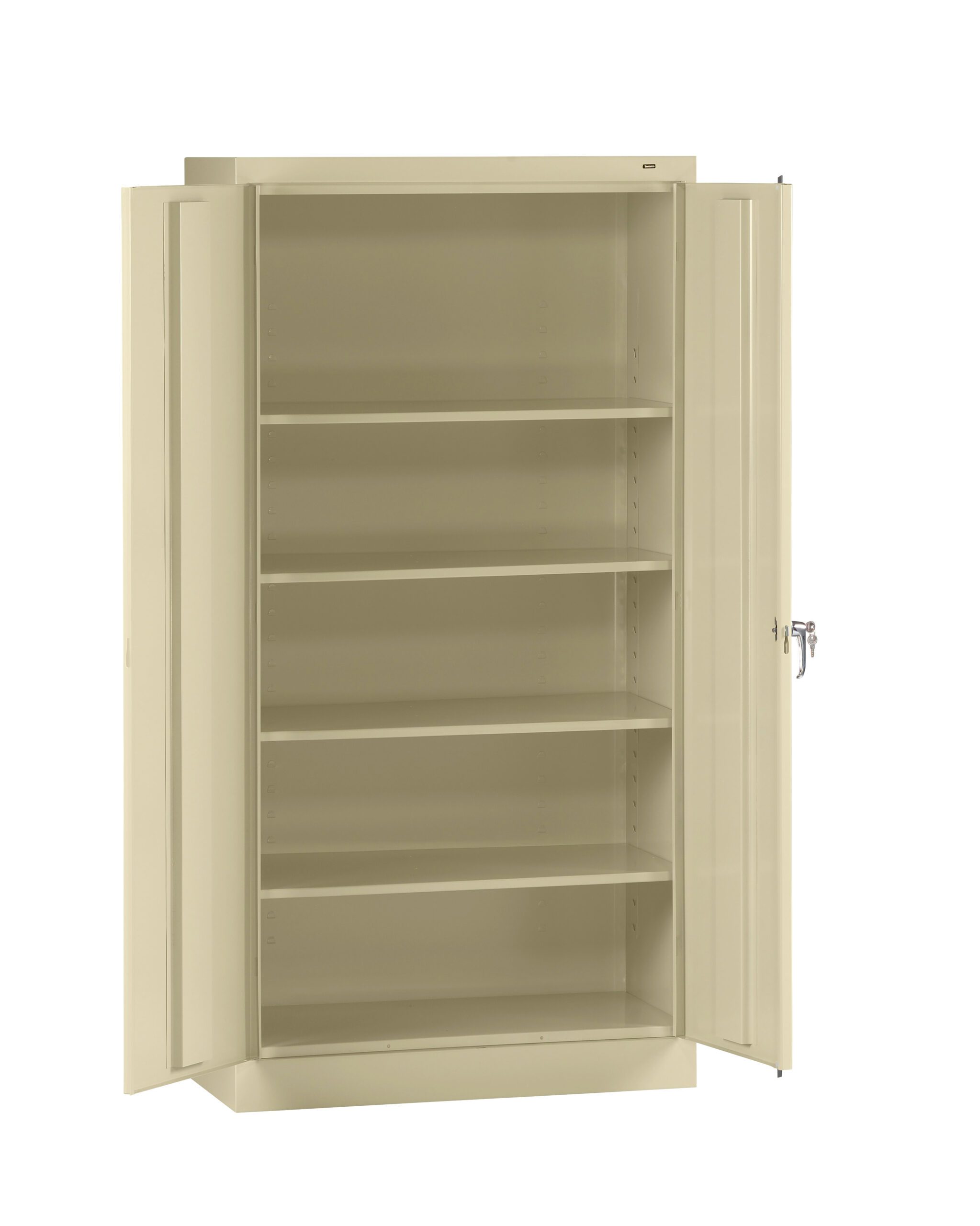 Standard cabinets are built with premium quality steel and reinforced doors for long-term performance at an attractive price. Polished chrome handle uses three-point keyed locking to lock both doors. Punched lances in back facilitate ventilation. Shelves adjust in 2″ increments without tools. Integrated shelf support tabs secure shelves tightly to cabinet without clips or added parts. Raised base keeps contents out of harm’s way from cleaning liquids.