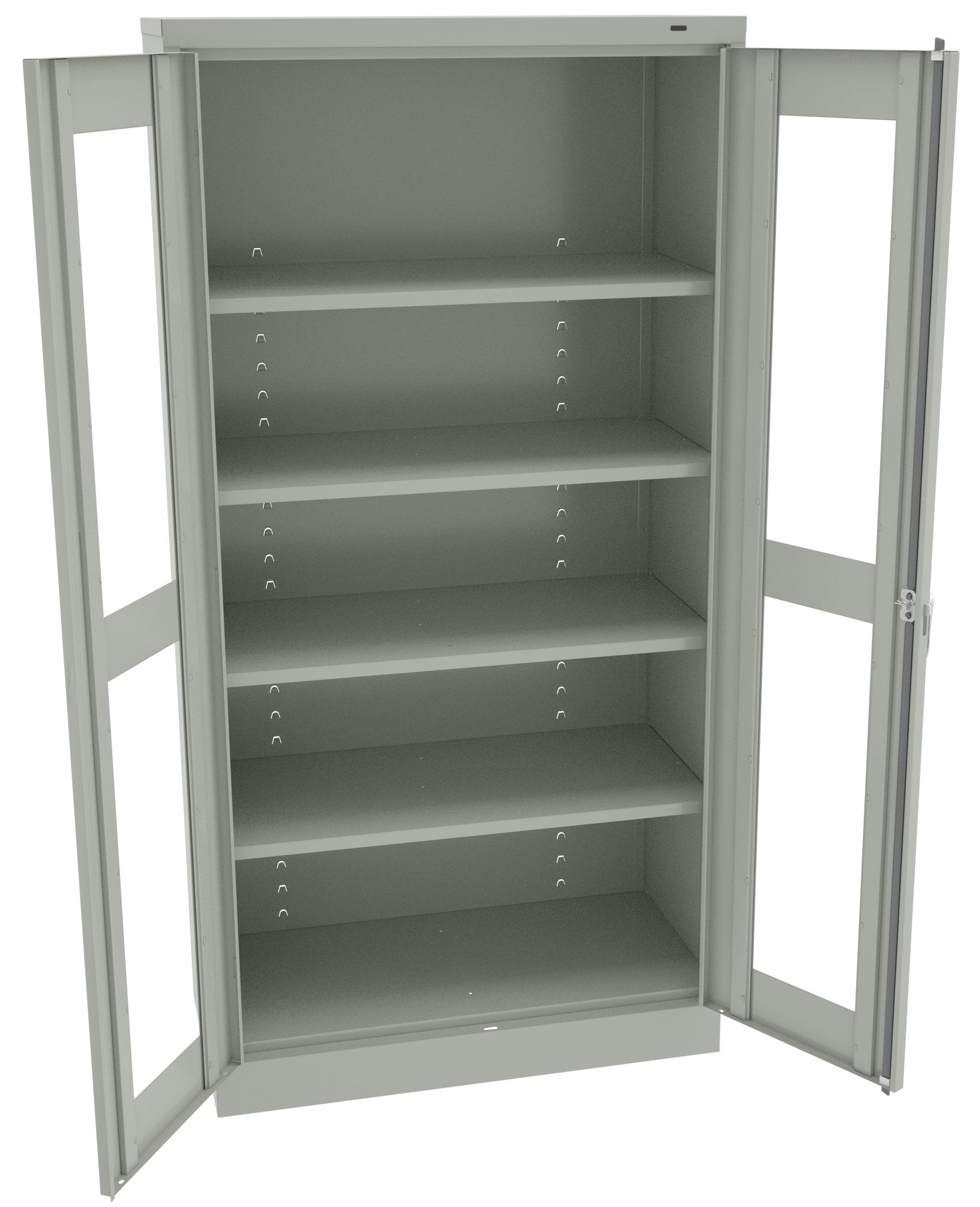 Standard cabinets are built with premium quality steel and reinforced doors for long-term performance at an attractive price. Polished chrome handle uses three-point keyed locking to lock both doors. Punched lances in back facilitate ventilation. Shelves adjust in 2″ increments without tools. Integrated shelf support tabs secure shelves tightly to cabinet without clips or added parts. Raised base keeps contents out of harm’s way from cleaning liquids.