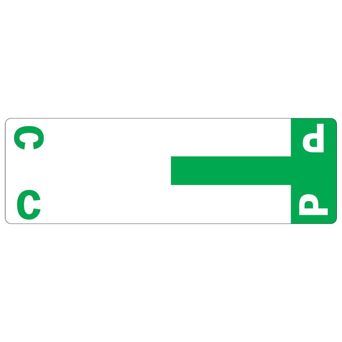 A parking sign with a white background and green T shape mirrors the C&P style. It features a left-facing C at top left and an opposite-facing P at top right, just like the organized Smead AlphaZ NCC Color-Coded Label sheet in dark green (67154).
