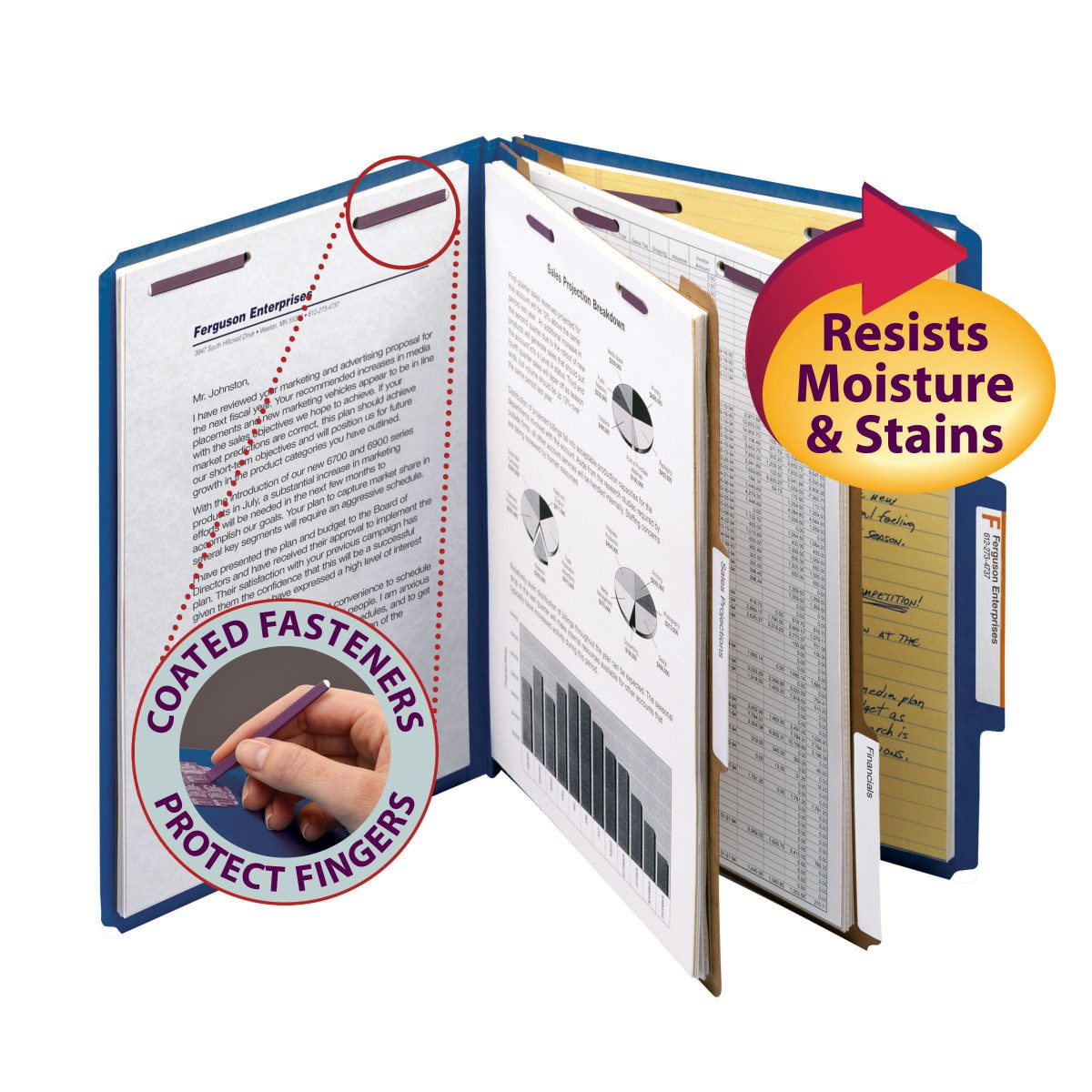 Protect your documents and fingers with Smead? patented SafeSHIELD?? Coated Fastener Technology;? the ultimate solution to fastener issues, including paper tears, finger cuts and excessive fastener crinkling. Heavy-duty classification folders make ideal project files. Use colors to signal category or type of project at a glance. Sturdy tear resistant gusset expands to hold up to 2″ of material. Two dividers provide 6 filing surfaces for ultimate organization.
