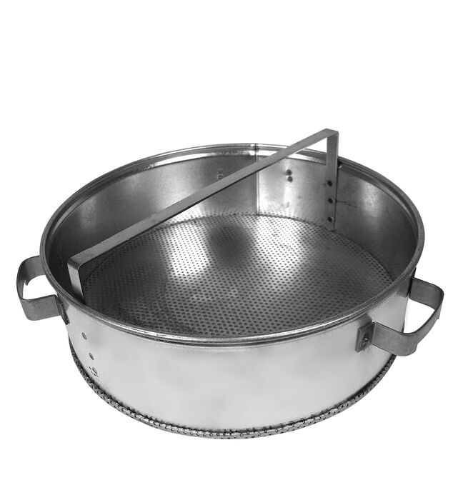 The Justrite Basket (models F/Dip27605 & Wash27713) is a round, silver metal sieve with two handles, a mesh bottom, and a central vertical divider for enhanced functionality.