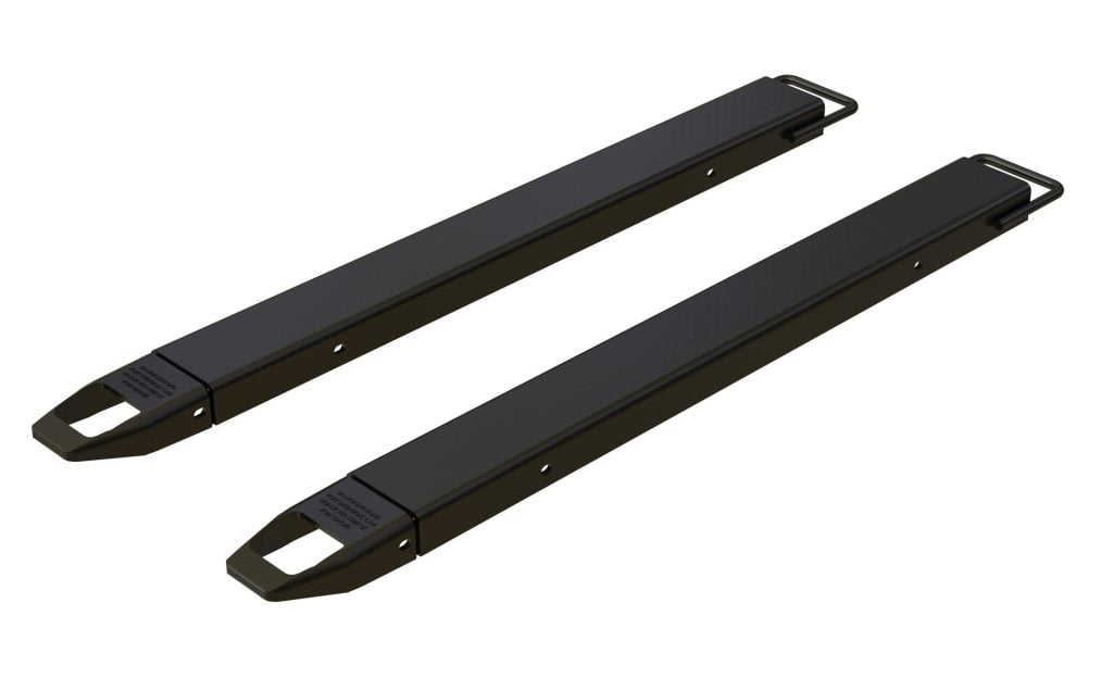 Provide the extra support needed to lift long or large objects with a fork truck using a pair of Fork Extensions. Welded steel construction with cast steel tips. Steel retaining strap prevents fork extensions from sliding off forks during use. Powder coat black finish. OSHA regulations require that extensions are no more than one-hundred and fifty (150) percent of the existing fork length. Insert loop at the tip of the fork and slide it up at a forty-five (45) degree angle. Then, lay it down over the existing fork. To be used with Class 2 and Class 3 forks only.