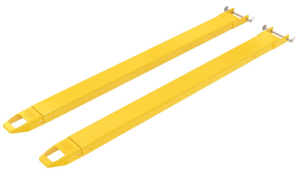 Provide the extra support needed to lift long or large objects with a fork truck using a pair of Fork Extensions. Welded steel construction with cast steel tips. Steel retaining strap prevents fork extensions from sliding off forks during use. Powder coat yellow finish. OSHA regulations require that extensions are no more than one-hundred and fifty (150) percent of the existing fork length. Remove pin and lay extension over fork or drive fork truck into the extension. Re-insert the pin behind the heel of the fork to secure extension. To be used with Class 2 and Class 3 forks only.
