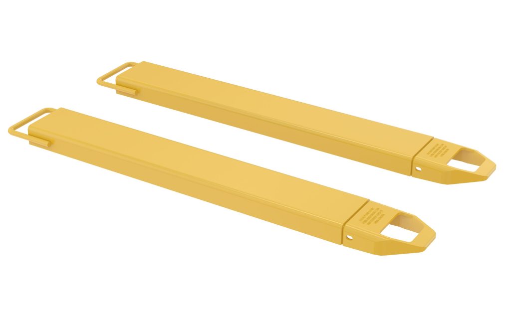 Provide the extra support needed to lift long or large objects with a fork truck using a pair of Fork Extensions. Welded steel construction with cast steel tips. Steel retaining strap prevents fork extensions from sliding off forks during use. Powder coat yellow finish. OSHA regulations require that extensions are no more than one-hundred and fifty (150) percent of the existing fork length. Insert loop at the tip of the fork and slide it up at a forty-five (45) degree angle. Then, lay it down over the existing fork. To be used with Class 2 and Class 3 forks only.