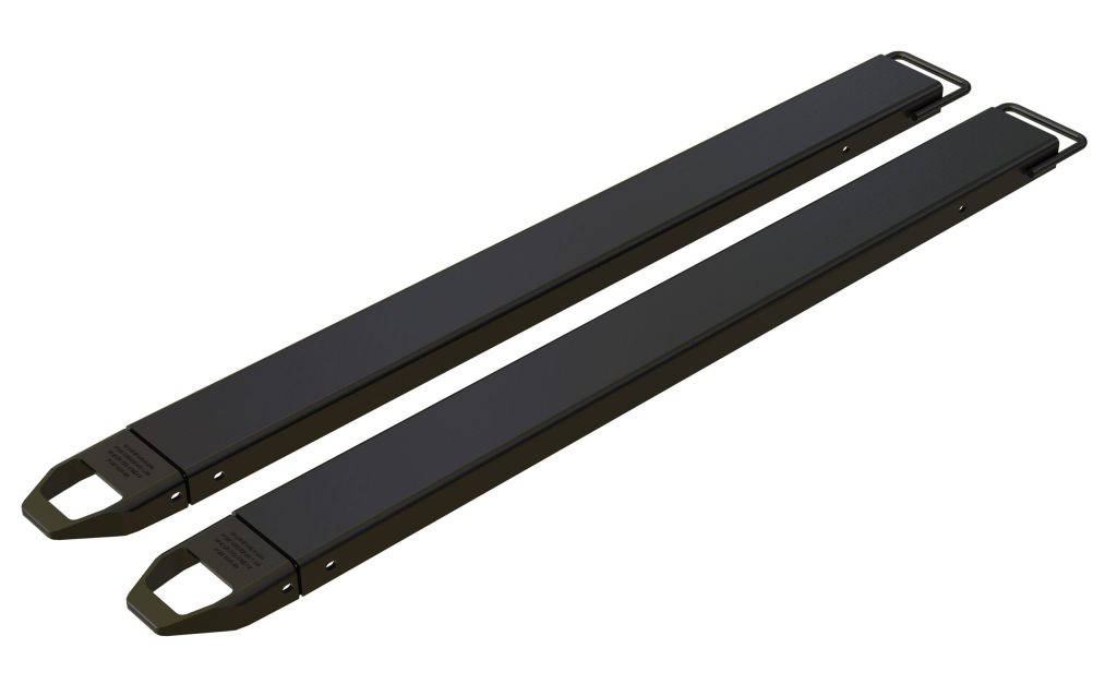 Provide the extra support needed to lift long or large objects with a fork truck using a pair of Fork Extensions. Welded steel construction with cast steel tips. Steel retaining strap prevents fork extensions from sliding off forks during use. Powder coat black finish. OSHA regulations require that extensions are no more than one-hundred and fifty (150) percent of the existing fork length. Insert loop at the tip of the fork and slide it up at a forty-five (45) degree angle. Then, lay it down over the existing fork. To be used with Class 2 and Class 3 forks only.