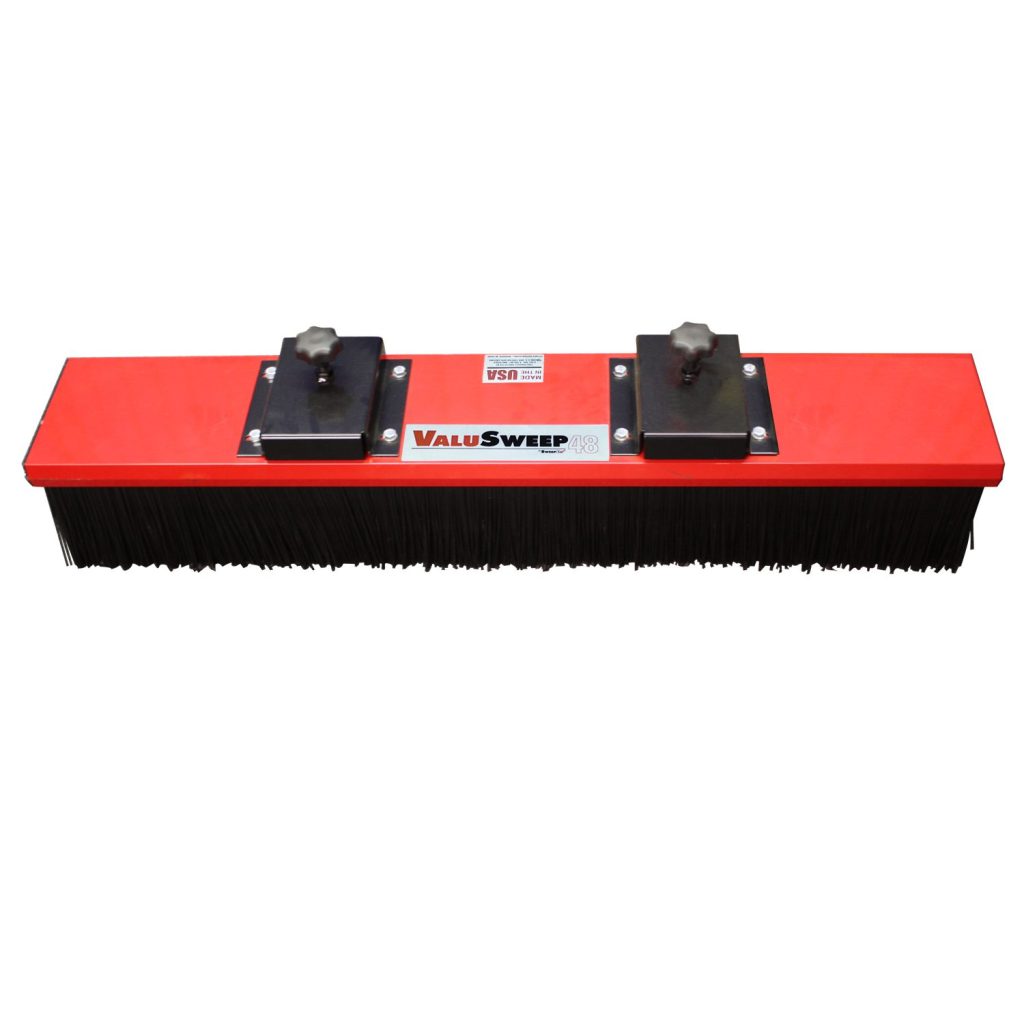 An American flag label adorns the red and black ValuSweep broom attachment with black bristles and two top mounting brackets, all set against a white background. It mirrors the innovative design of the Vestil Fork Truck Mounted Sweeper W/48 In Brush.