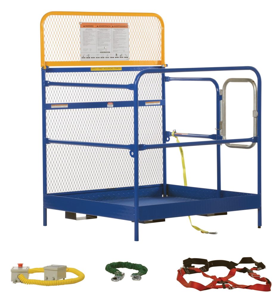 This convenient fork truck Work Platform quickly and safely raises maintenance personnel where they are needed. Attaches to fork truck by inserting forks into fork pockets and securing platform to fork truck. Fork locks secure platform to forks. Dual handrails on three (3) sides. Expanded metal backing on fourth side. Includes checker floor plate platform and long strap with hook to attach platform to fork truck. A maximum of two (2) people can be in the work platform at one time. This unit includes an Emergency Stop Button Kit and Web Lanyard with Safety Harness.
