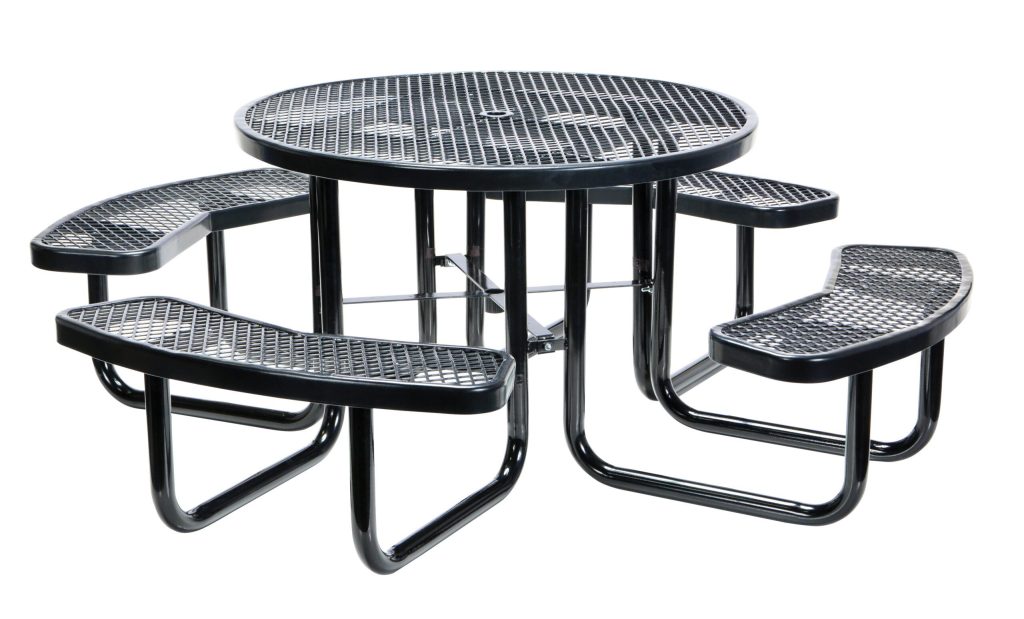 Built to last and highly attractive, this commercial grade Metal Picnic Table is constructed of expanded metal that features a diamond pattern. Finished to endure the elements with virtually no maintenance. Tops and seats are coated with a rugged thermoplastic layer that’s attractive and durable. Galvanized tubular steel legs and supports are protected with a black powder coat finish designed for strength and stability.
