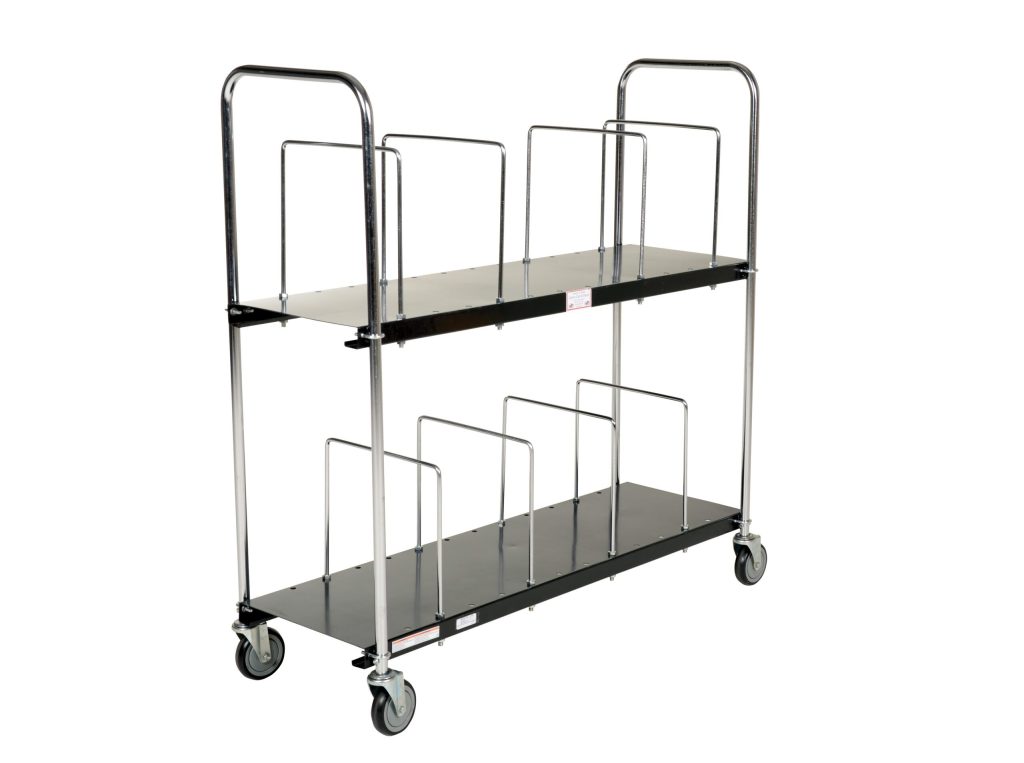 The Portable Carton Cart is designed to store, organize, and transport your empty cardboard boxes. Unit has chrome plated uprights and frame dividers with powder coated black shelves. This Carton Cart features two (2) adjustable-height shelves with adjustable box dividers ideal for small boxes. The cart rolls on four (4) swivel casters for easy maneuverability.