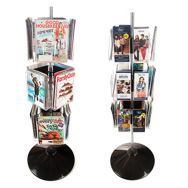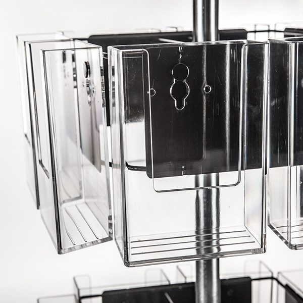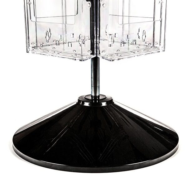 Black metal tube with clear acrylic pockets and round molded plastic base