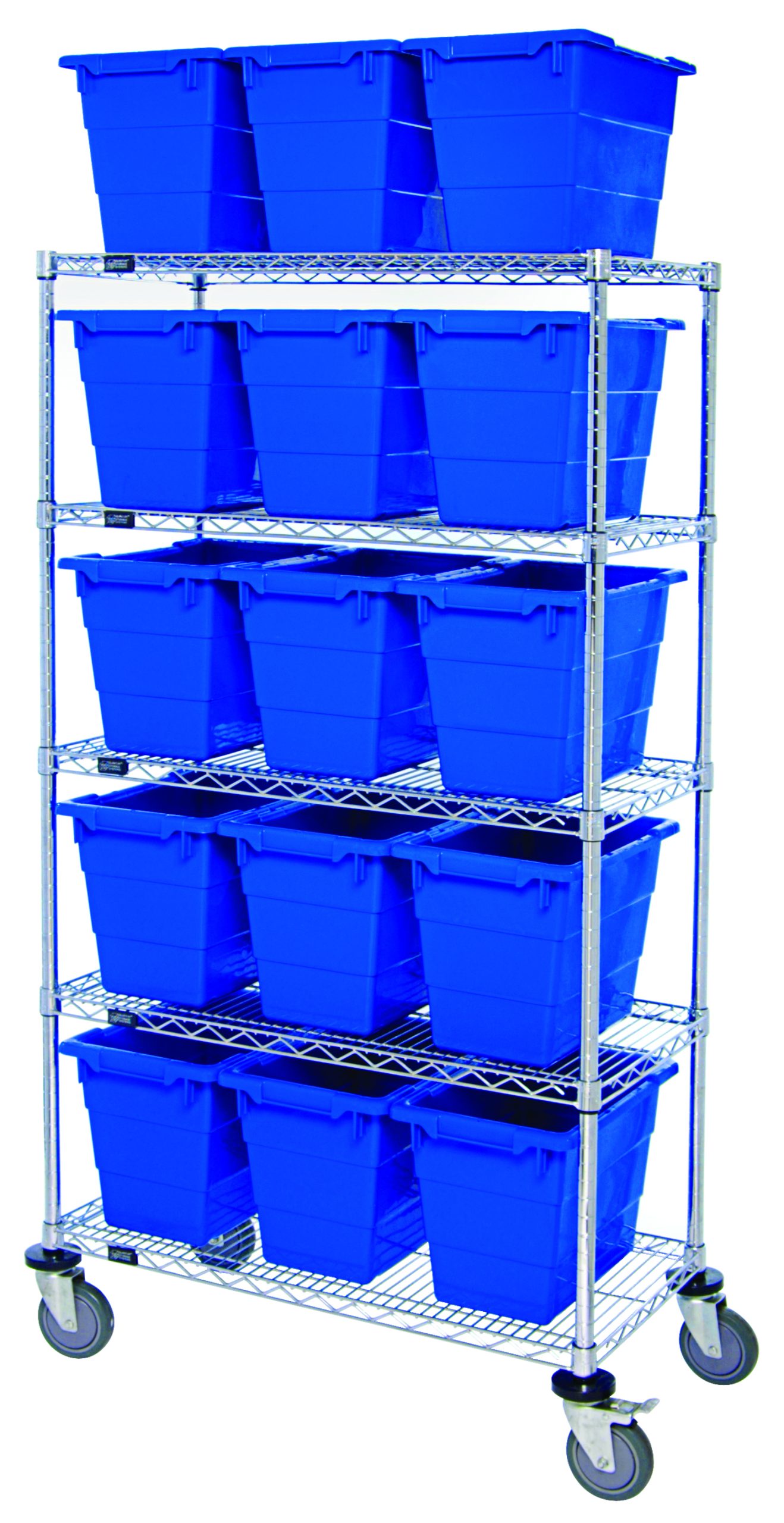 Bin System Unit, mobile, 60″W x 18″D x 69″H, includes (5) wire shelves, (15) 17-1/4″L x 11″W x 12″H (TUB1711-12) blue bin and (4) 5″ swivel casters, (2) with brake, chrome plated finish, shipped KD