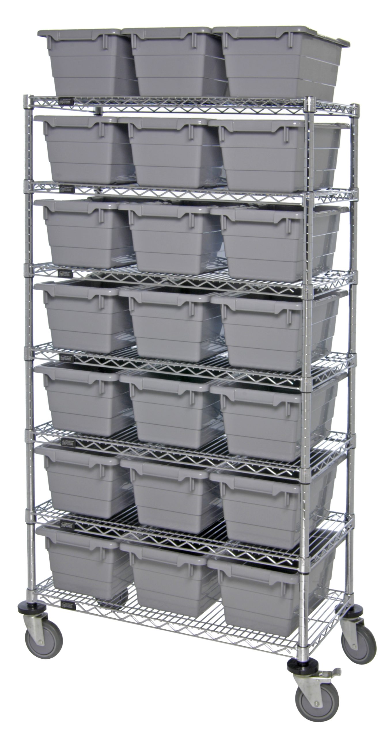 Quantum Bin System Unit, Mobile, 60″W X 18″D X 69″H, Includes (7) Wire Shelves, (24) 17-1/4″L X 11″W X 8″H (Tub1711-8) Gray Bin And (4) 5″ Swivel Casters, (2) With Brake, Chrome Plated Finish, Shipped Kd