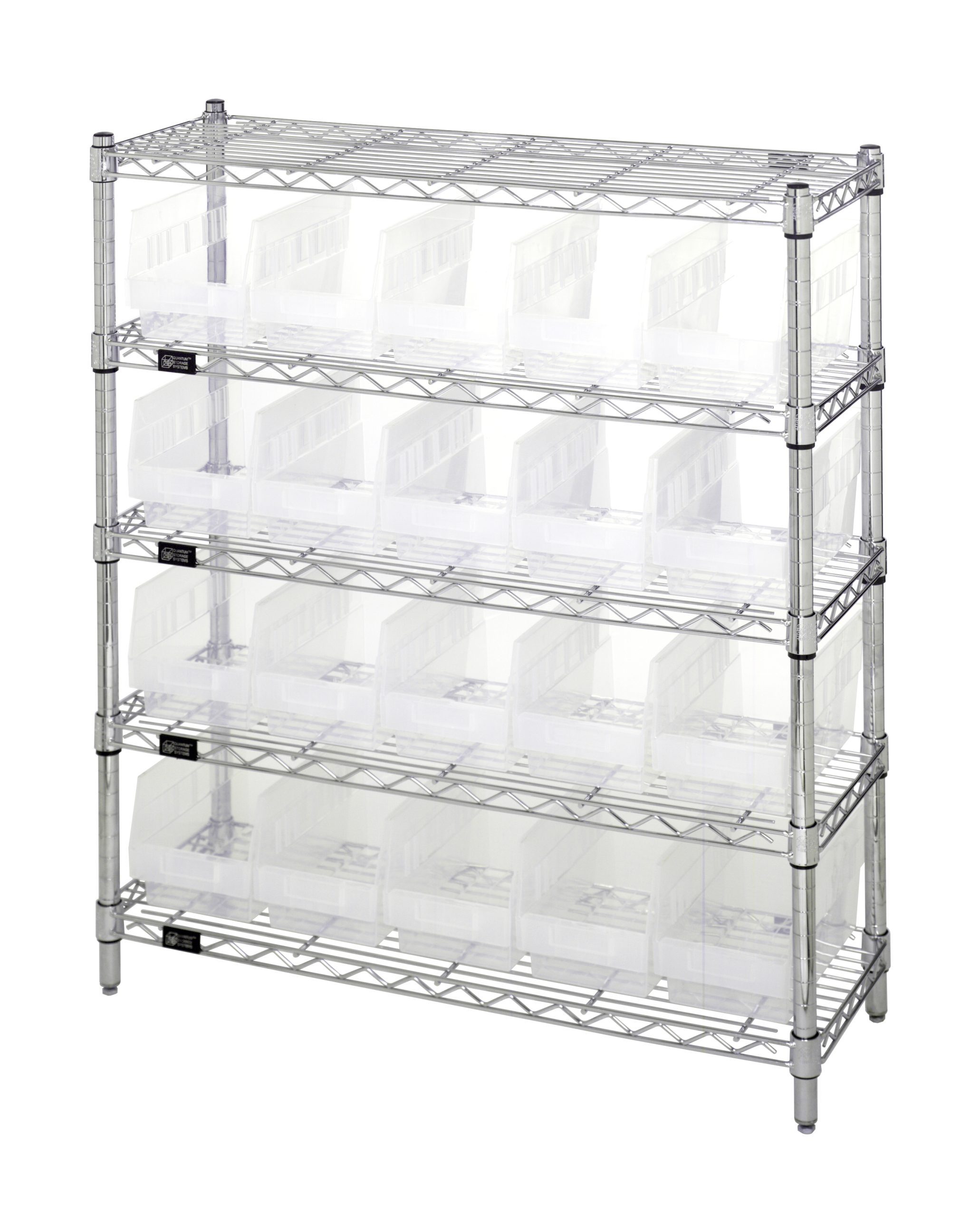 Quantum Bin Wire Shelving Center, 12″D X 36″W X 39″H, 800 Lbs Capacity Per Shelf, Includes: (5) Shelves And (20) Qsb202 Clear Bins, Chrome Plated Finish, Shipped Kd