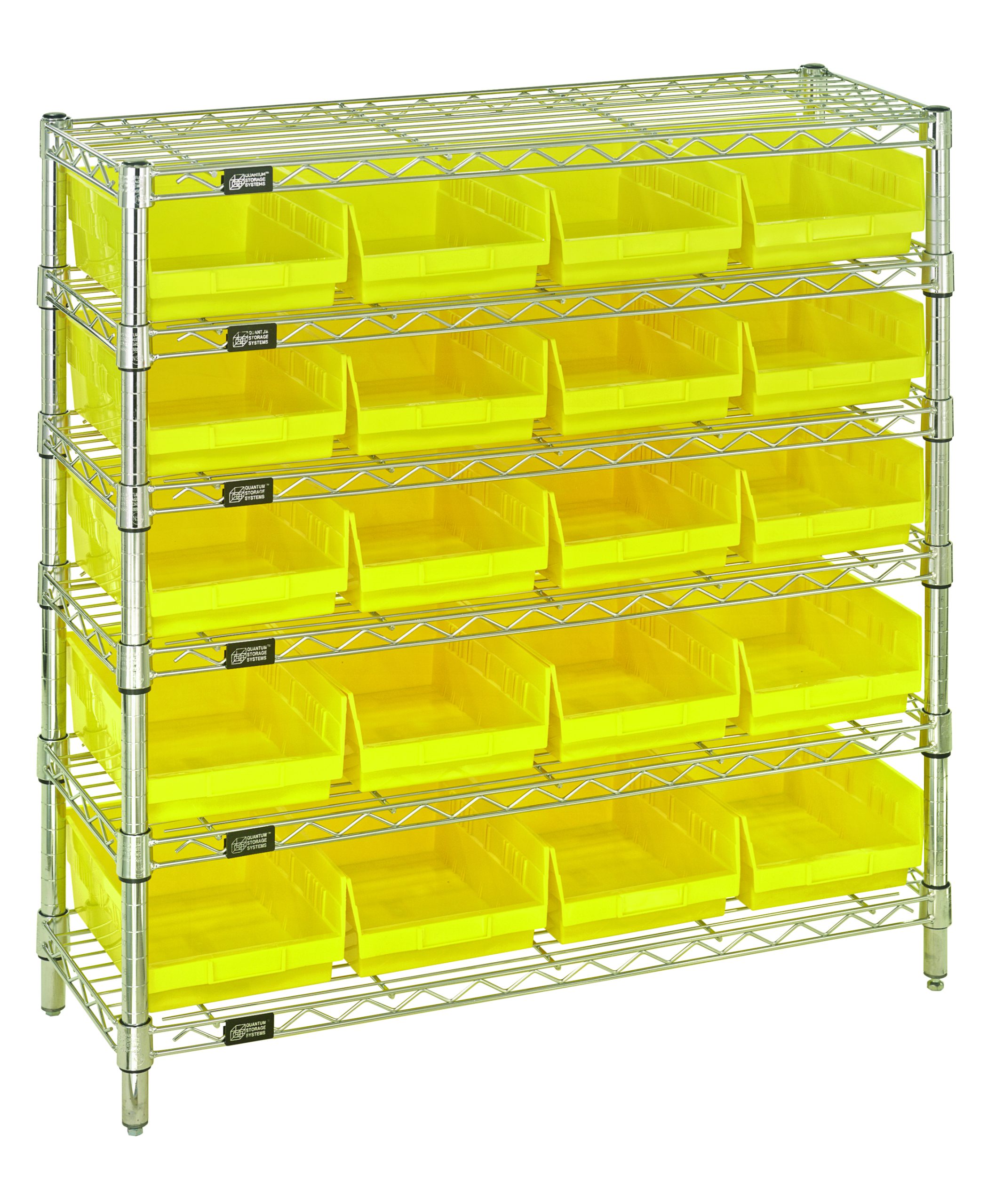 Quantum Bin Wire Shelving System, 36″W X 12″D X 36″H Overall Size, 800 Lb. Capacity Per Shelf, Includes: (6) Wire Shelves, (4) Posts, (20) Qsb107 Yellow Bins, Chrome Plated Finish