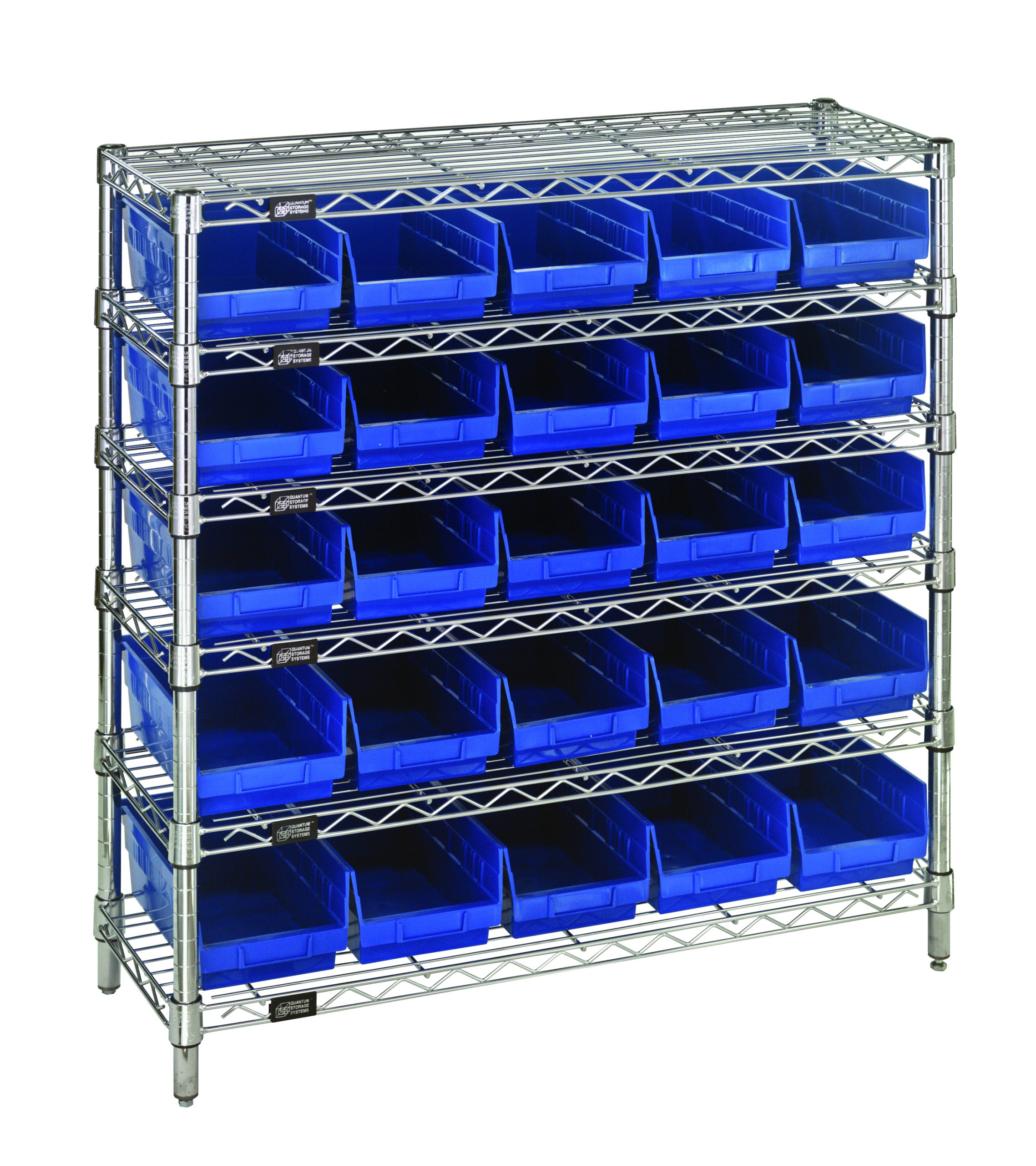 Quantum Bin Wire Shelving System, 36″W X 12″D X 36″H Overall Size, 800 Lb. Capacity Per Shelf, Includes: (6) Wire Shelves, (4) Posts, (25) Qsb102 Blue Bins, Chrome Plated Finish