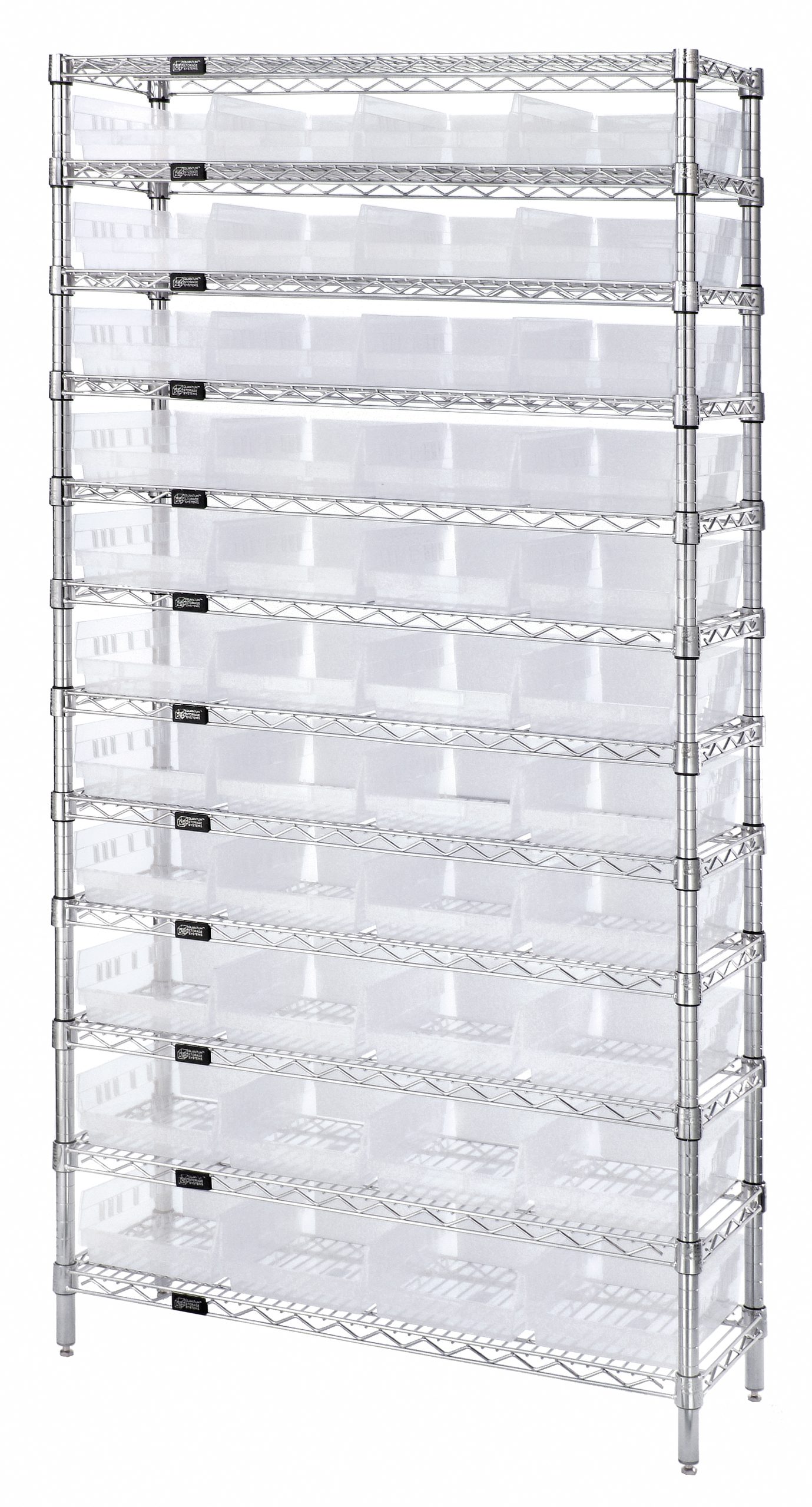 Bin Wire Shelving System, 36″W x 12″D x 74″H overall size, 800 lb. capacity per shelf, includes: (12) wire shelves, (4) posts, and (44) QSB107 clear bins, chrome plated finish