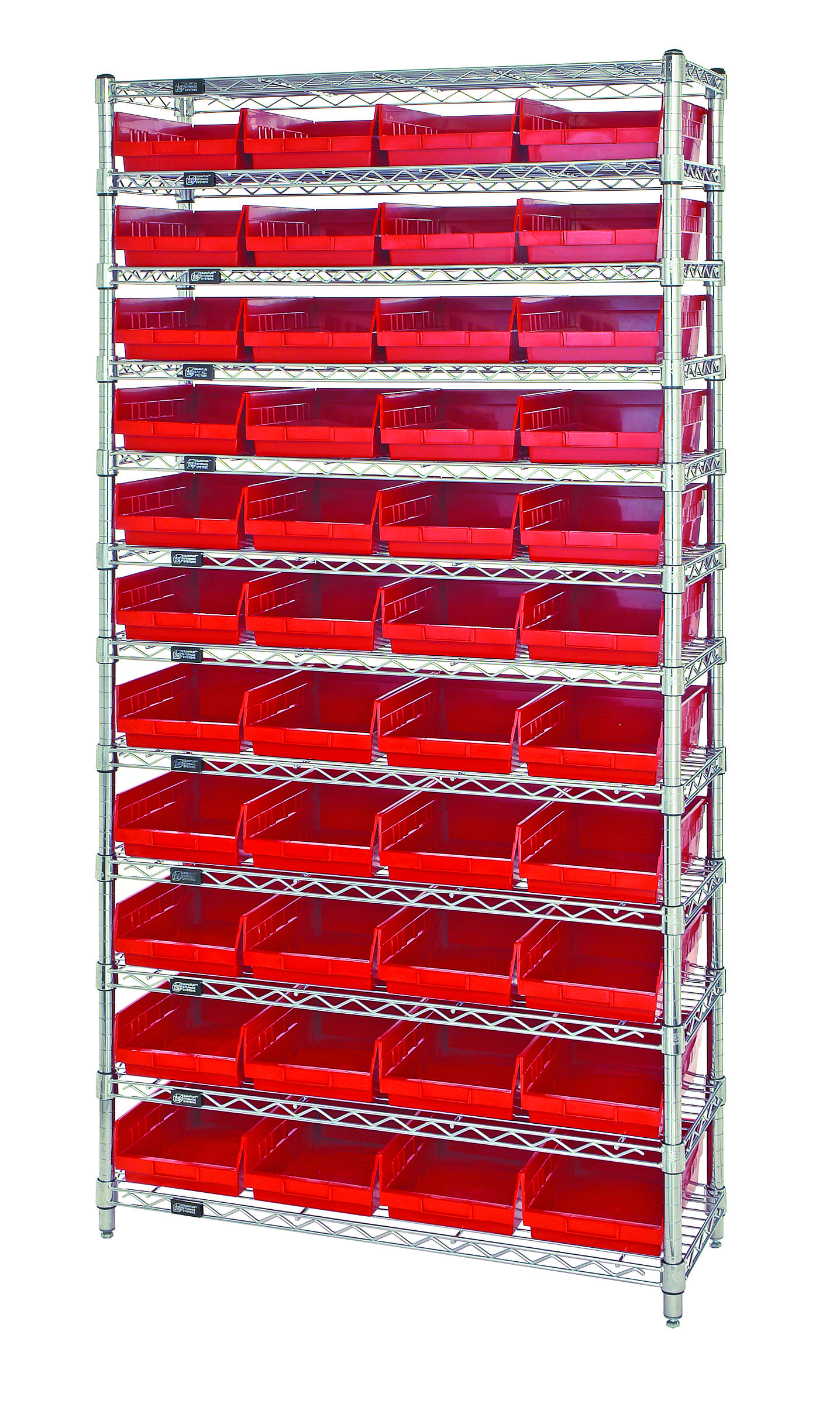 Bin Wire Shelving System, 36″W x 12″D x 74″H overall size, 800 lb. capacity per shelf, includes: (12) wire shelves, (4) posts, and (44) QSB107 red bins, chrome plated finish