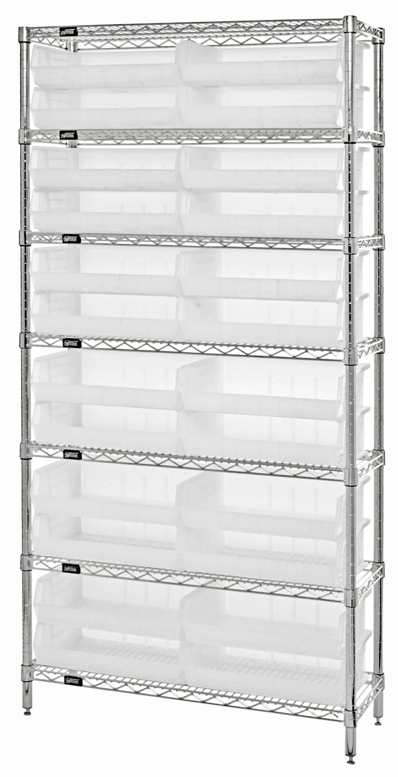 Bin Wire Shelving System, 36″W x 12″D x 74″H overall size, 800 lb. capacity per shelf, includes: (7) wire shelves, (4) posts, and (24) QUS245 clear bins, chrome plated finish