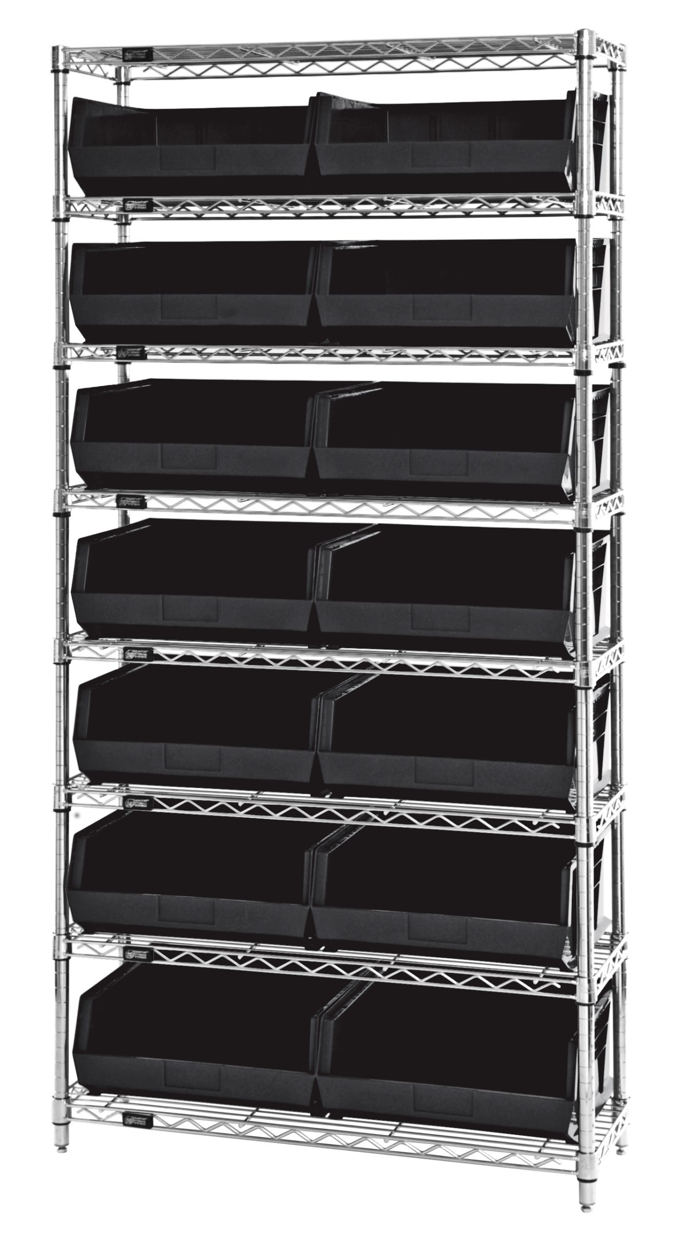 Bin Wire Shelving System, 36″W x 14″D x 74″H, 800 lbs load capacity per shelf, includes: (8) shelves and (14) QUS250 black bins, chrome plated finish, shipped KD