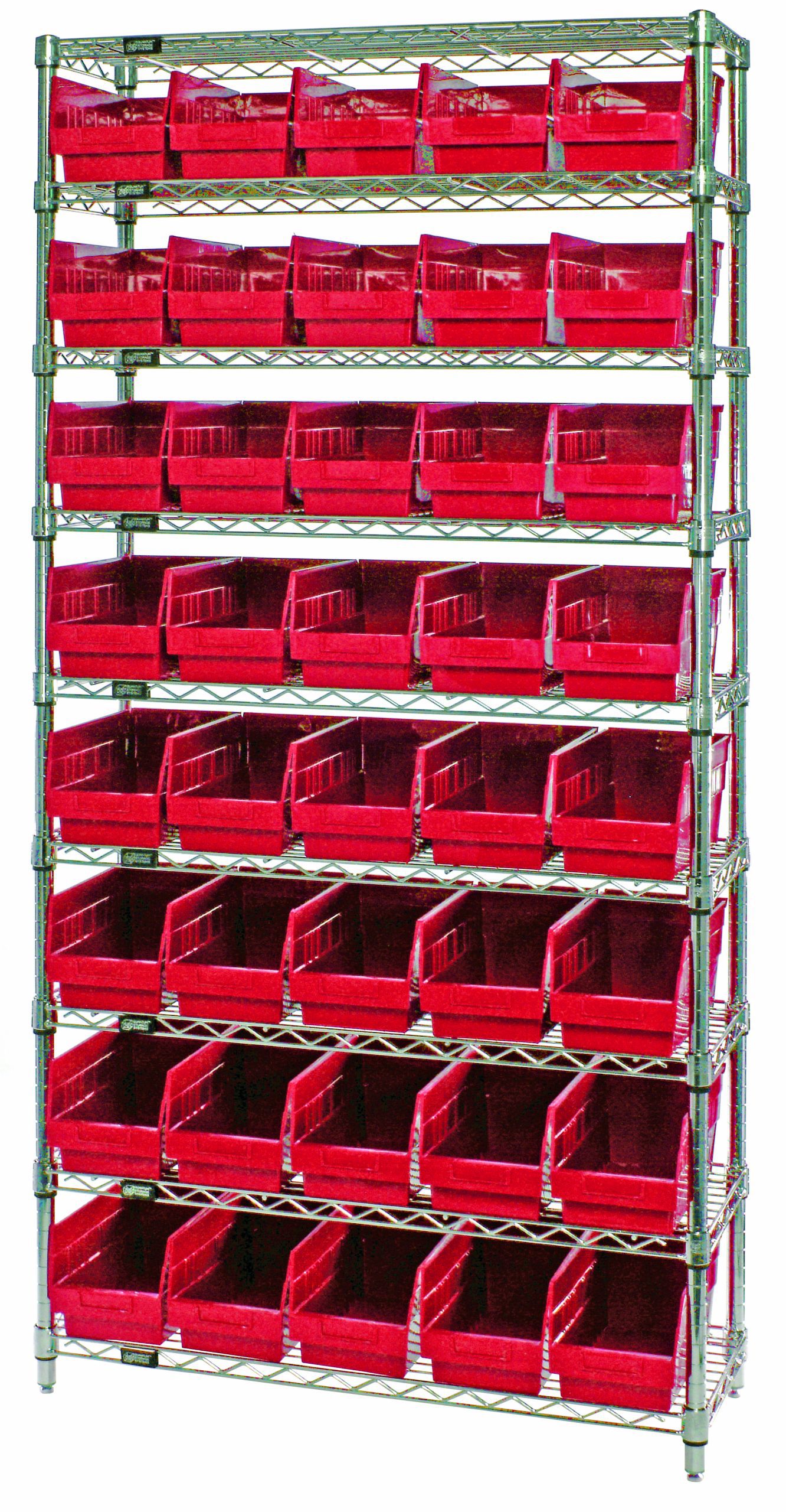 -57%Bin Wire Shelving System, 36″W x 18″D x 74″H overall size, 800 lb. capacity per shelf, includes: (9) wire shelves, (4) posts, and (40) QSB204 red bins, chrome plated finish