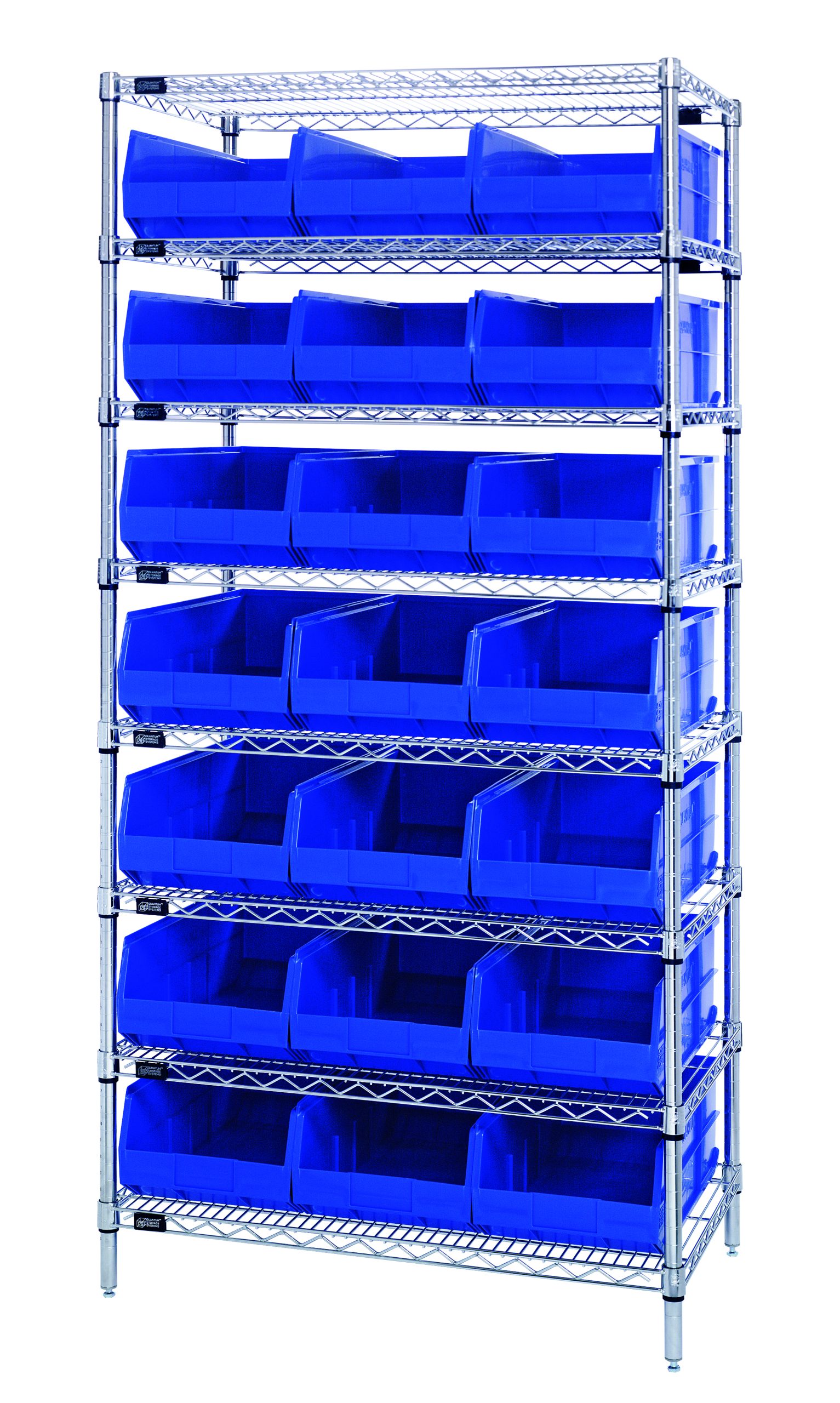 Quantum Bin Wire Shelving System, 36″W X 21″D X 74″H, 800 Lbs Load Capacity Per Shelf, Includes: (8) Shelves And (21) Ssb485 Blue Bins, Chrome Plated Finish, Shipped Kd