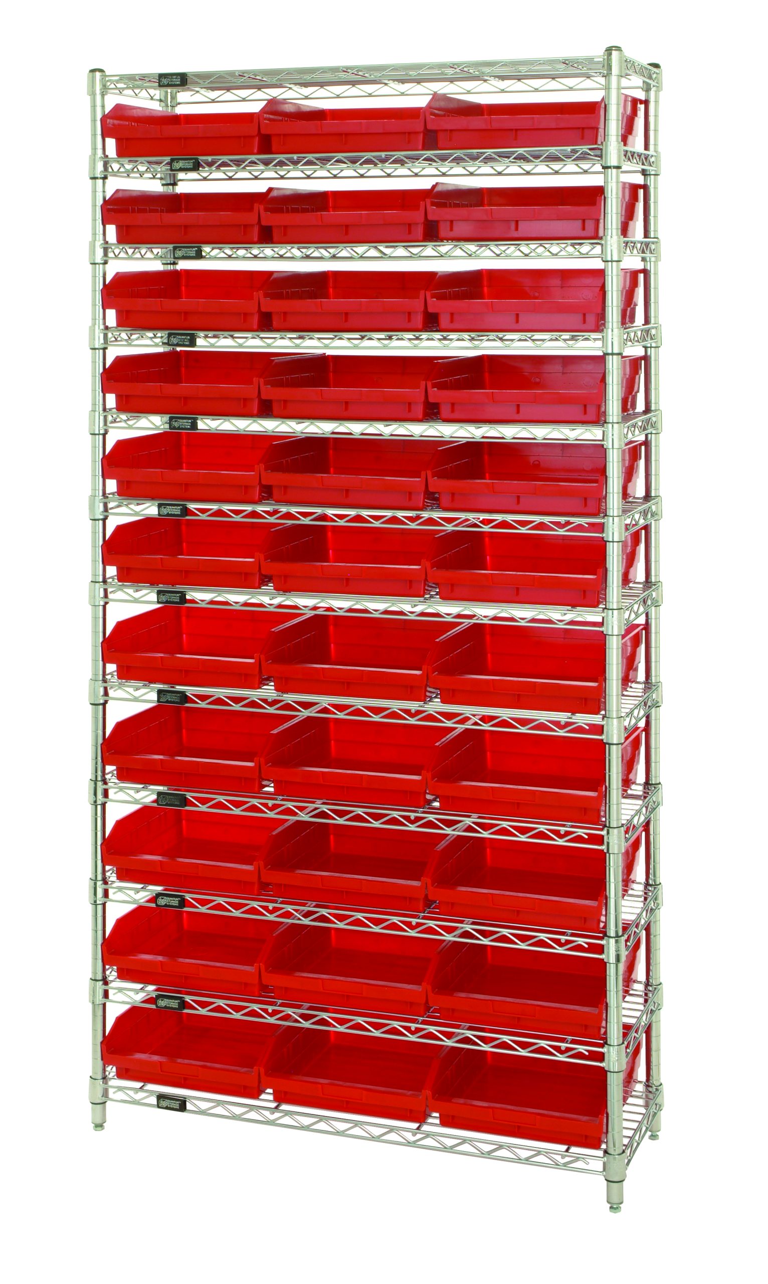 Bin Wire Shelving System, 36″W x 24″D x 74″H overall size, 800 lb. capacity per shelf, includes: (12) wire shelves, (4) posts, and (33) QSB116 red bins, chrome plated finish