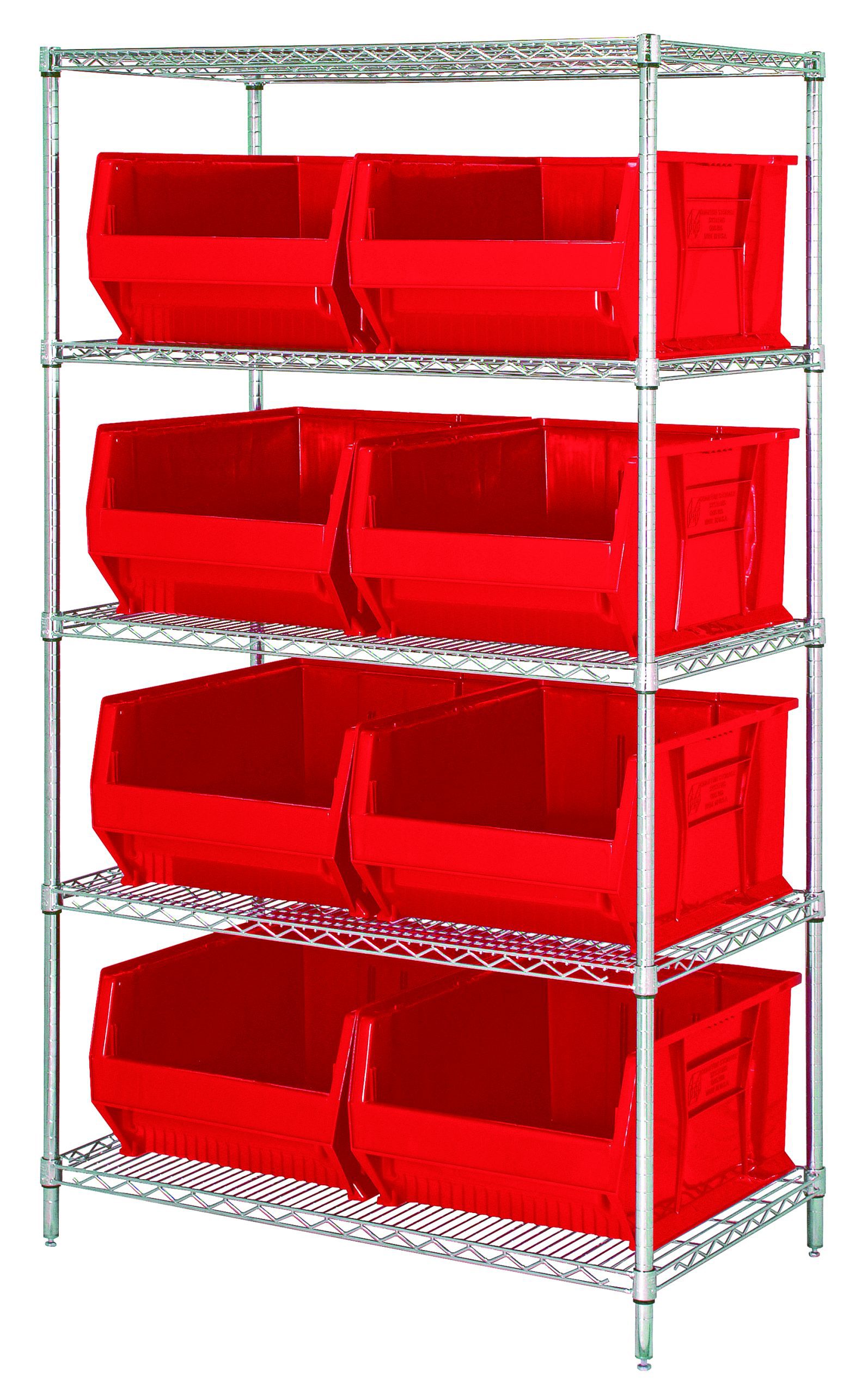Bin Wire Shelving System, 42″W x 24″D x 74″H overall size, 800 lb. capacity per shelf, includes: (5) wire shelves, (4) posts, and (8) QUS955 red bins, chrome plated finish, shipped KD