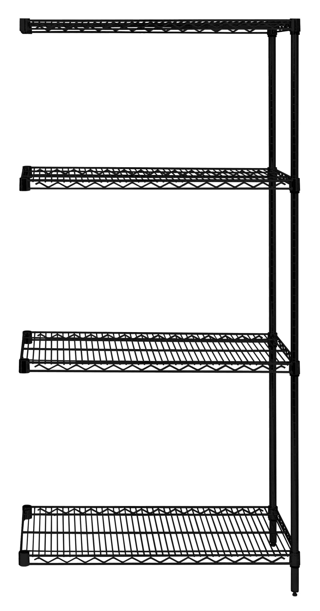 Wire Shelving Add-On Kit, 36″W x 14″D x 54″H, 600 – 800 lb. capacity, includes (4) wire shelves, (2) posts and (8) S-Hooks, black epoxy antimicrobial finish, NSF, shipped KD