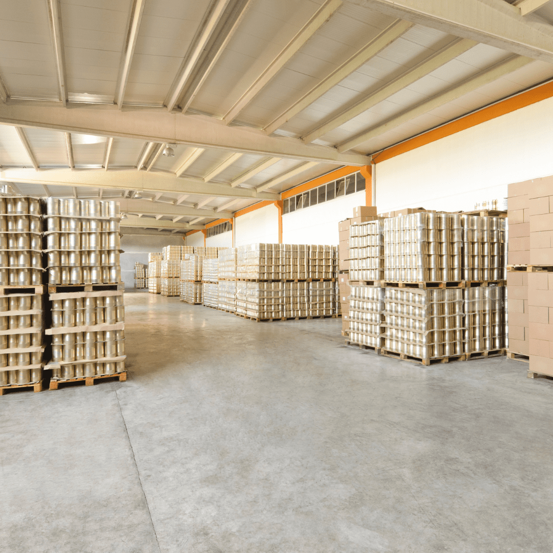 A spacious warehouse interior with a concrete floor features neat stacks of cardboard boxes and sealed metal barrels arranged on Interlake pallet racks. These organized materials, part of leading material handling solutions in Utah, rest below a high, white ceiling.