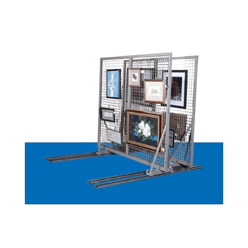 A mobile art storage rack on wheels features various framed paintings and sketches displayed on both side panels. The rack, akin to commercial mobile shelving units, is set against a blue background, showcasing floral and abstract artworks.