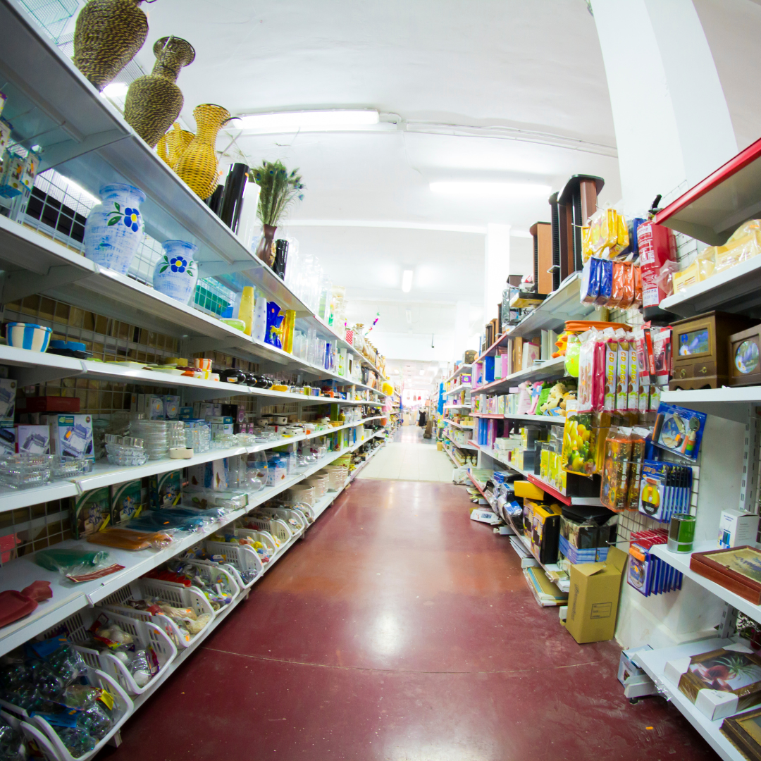 A brightly lit store aisle is lined with industrial storage racks, filled with glassware, cleaning supplies, and kitchen gadgets. The reddish-brown tile floor contrasts the neat rows of goods. Captured with a fisheye lens effect, the scene exudes the essence of Utahs efficient material handling solutions.