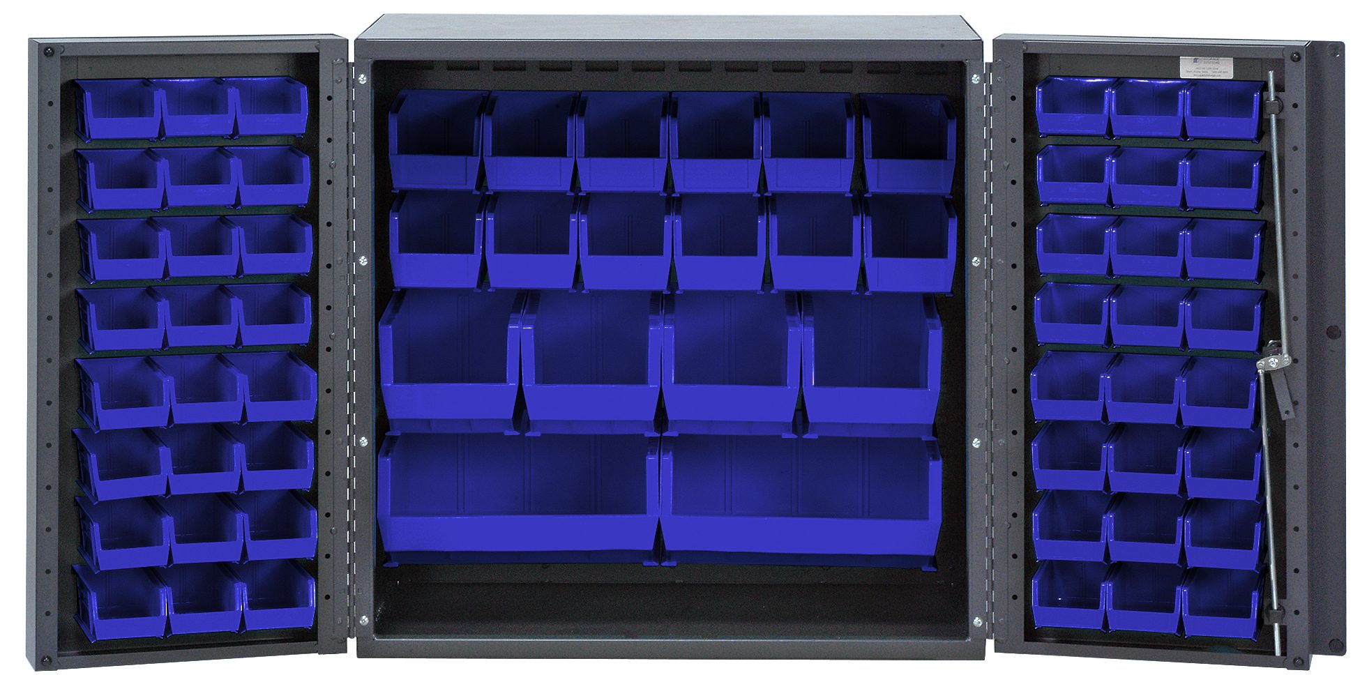 Heavy-Duty 36″ Bin Cabinet, 36″W x 24″D x 36″H, 14 gauge all welded construction, includes: (24) QUS210, (24) QUS220, (12) QUS230, (4) QUS240 and (2) QUS250 blue bins, gray powder-coated finish