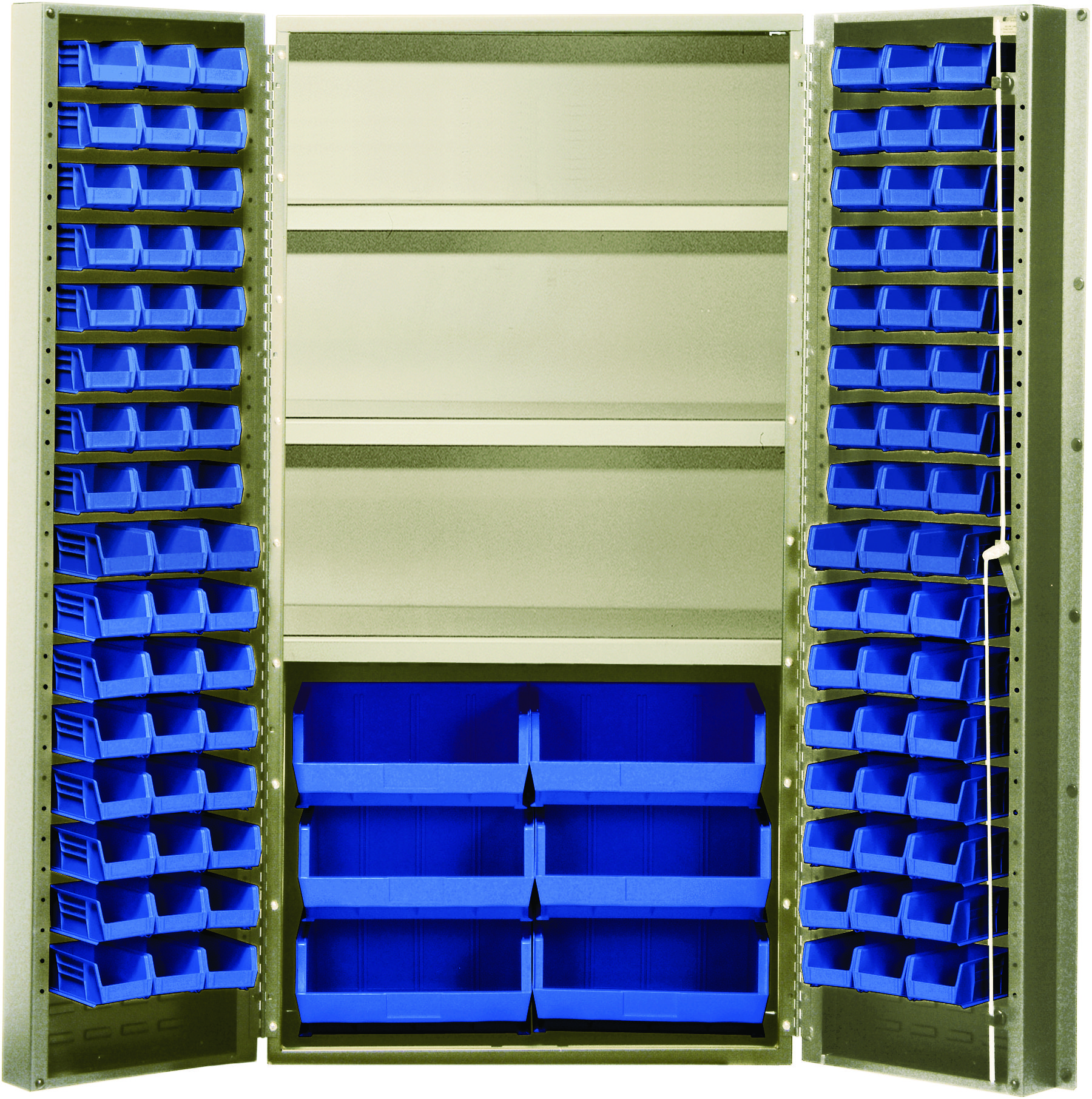 -58%Heavy-Duty 36″ Bin Cabinet, 36″W x 24″D x 72″H, 800 lb. capacity per interior shelf, 14 gauge all welded construction, includes: (3) adjustable shelves, (16) QUS232, (16) QUS236 and (6) QUS250 blue bins, beige powder-coated finish