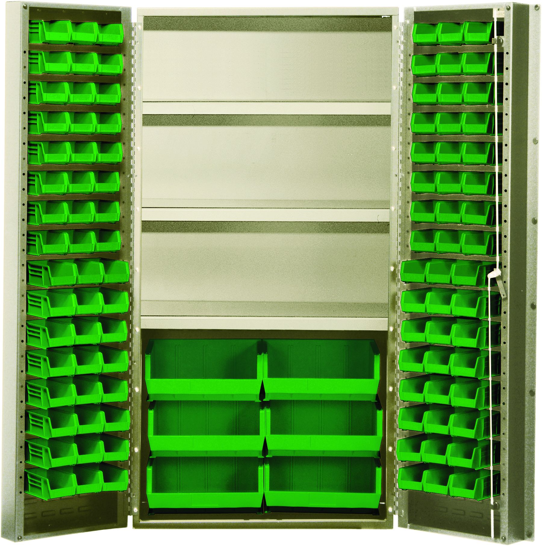 Heavy-Duty 36″ Bin Cabinet, 36″W x 24″D x 72″H, 800 lb. capacity per interior shelf, 14 gauge all welded construction, includes: (3) adjustable shelves, (16) QUS232, (16) QUS236 and (6) QUS250 green bins, beige powder-coated finish