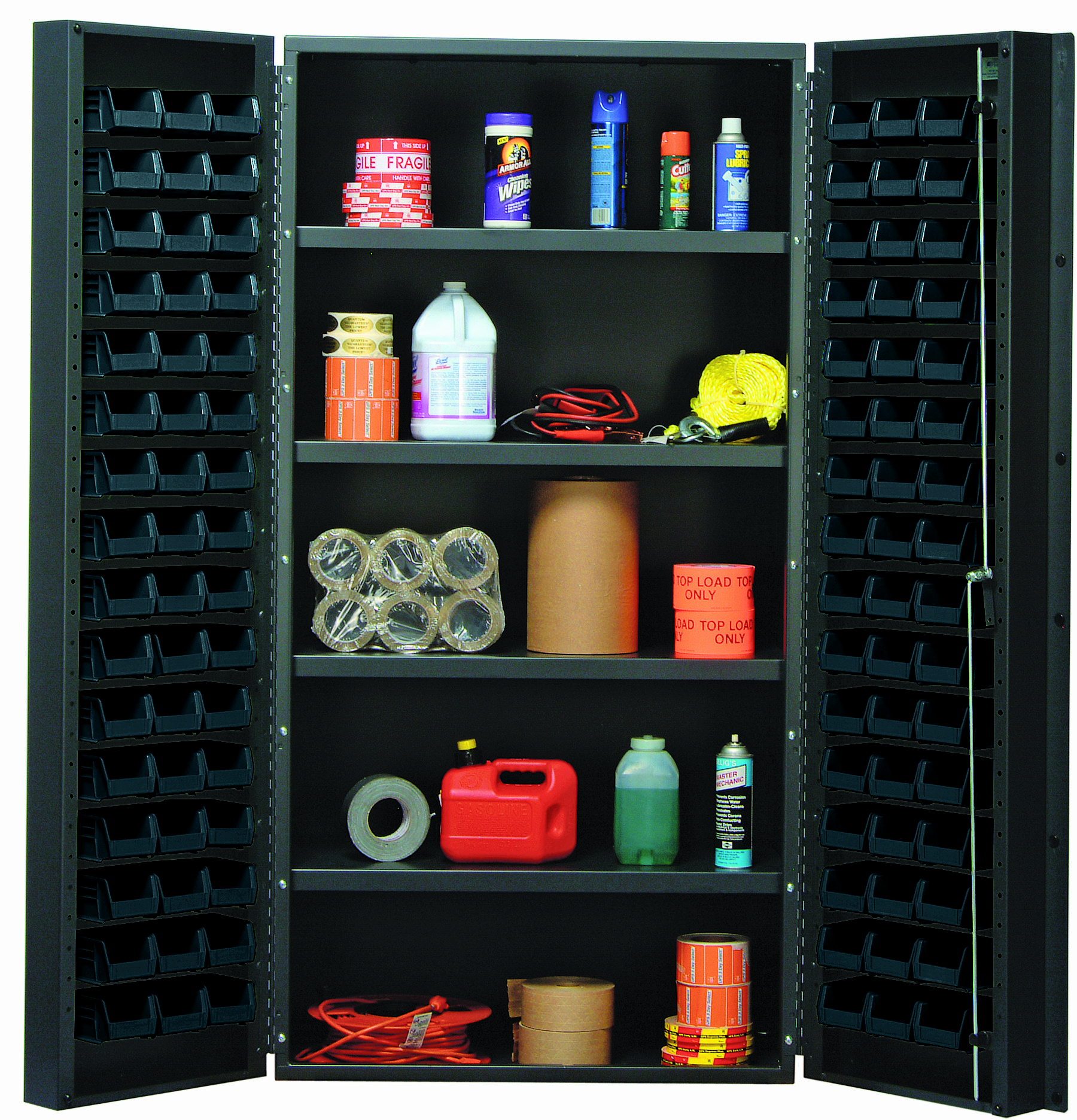 Heavy-Duty 36″ Bin Cabinet, 36″W x 24″D x 72″H, 800 lb. capacity per interior shelf, 14 gauge all welded construction, includes: (92) QUS210 black bins, gray powder-coated finish
