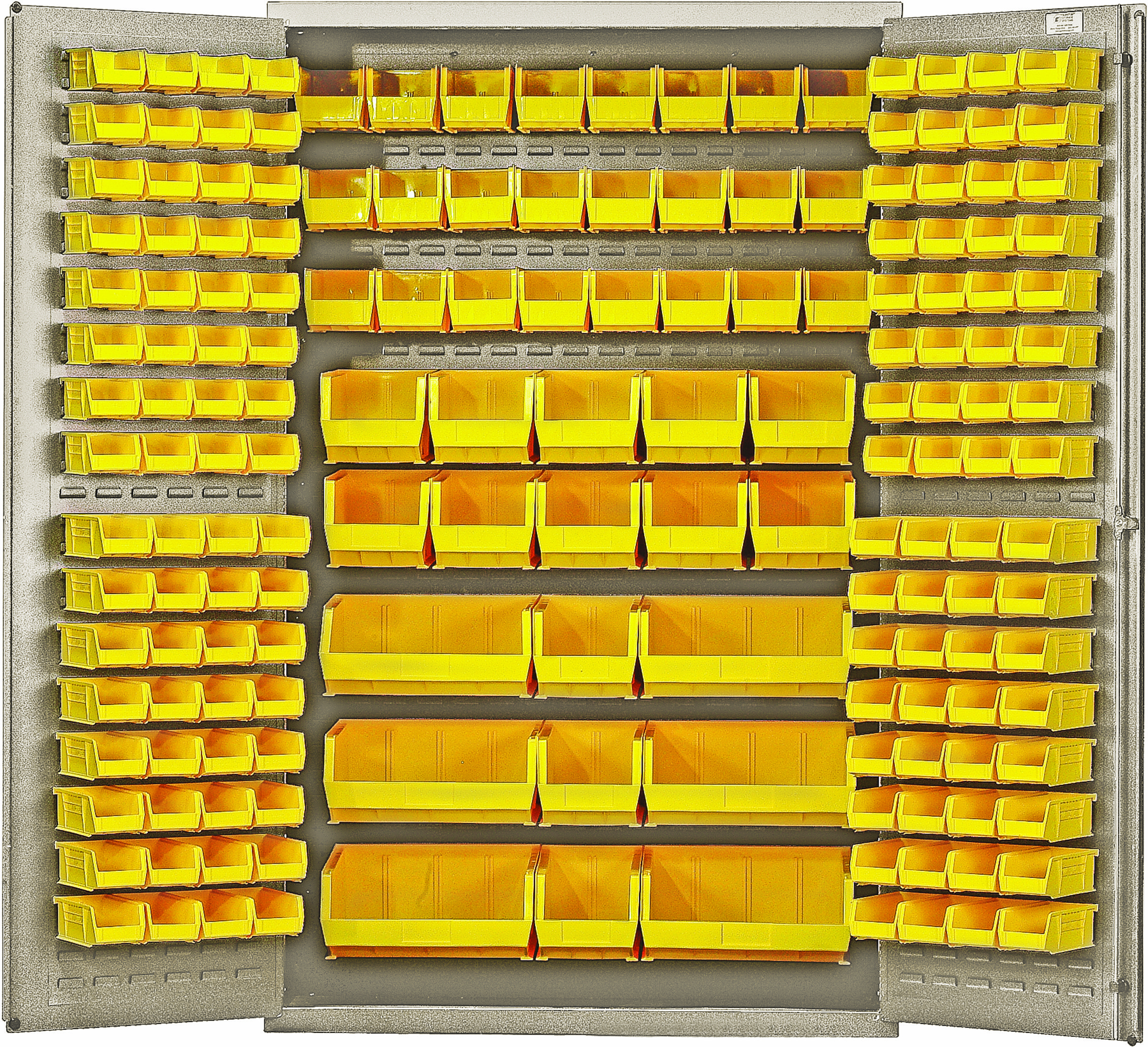Heavy-Duty 48″ Bin Cabinet, 48″W x 24″D x 78″H, 14 gauge all welded construction, includes: (64) QUS210, (64) QUS220, (24) QUS230, (13) QUS240 and (6) QUS250 yellow bins, beige powder-coated finish