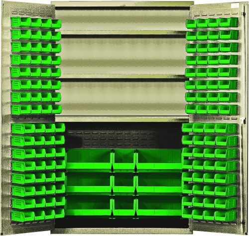 -58%Heavy-Duty 48″ Bin Cabinet, 48″W x 24″D x 78″H, 400 lb. capacity per interior shelf, 14 gauge all welded construction, includes: (3) adjustable shelves, (64) QUS210, (64) QUS220, (3) QUS240 and (6) QUS250 green bins, beige powder-coated finish