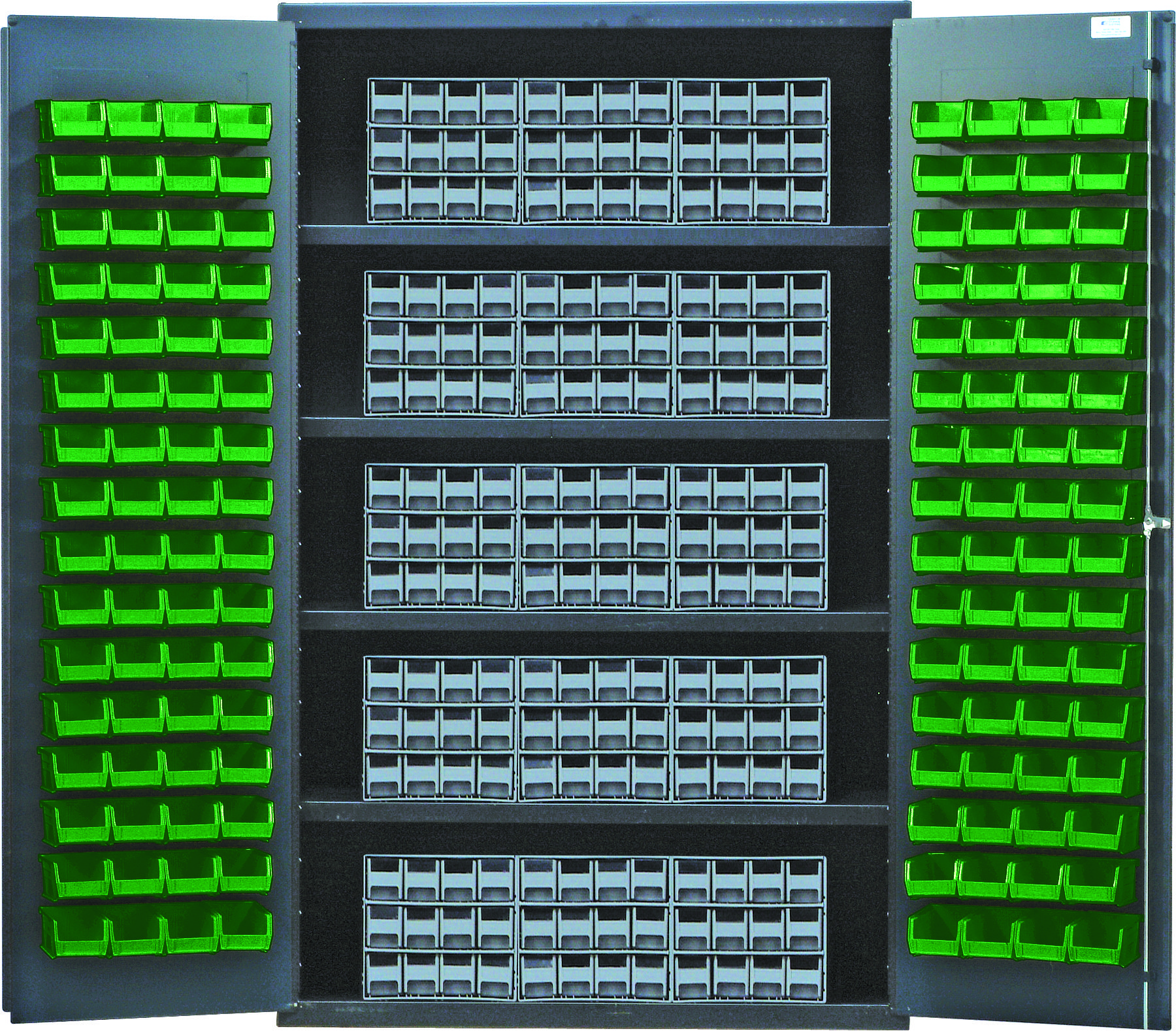 Heavy-Duty 48″ Bin Cabinet, interlocking drawer storage, 48″W x 24″D x 78″H, 400 lb. load capacity per shelf, 14 gauge all welded construction, includes: (4) shelves, (15) QIC-122 gray interlocking drawers and (128) QUS210 green bins, gray powder-coated finish
