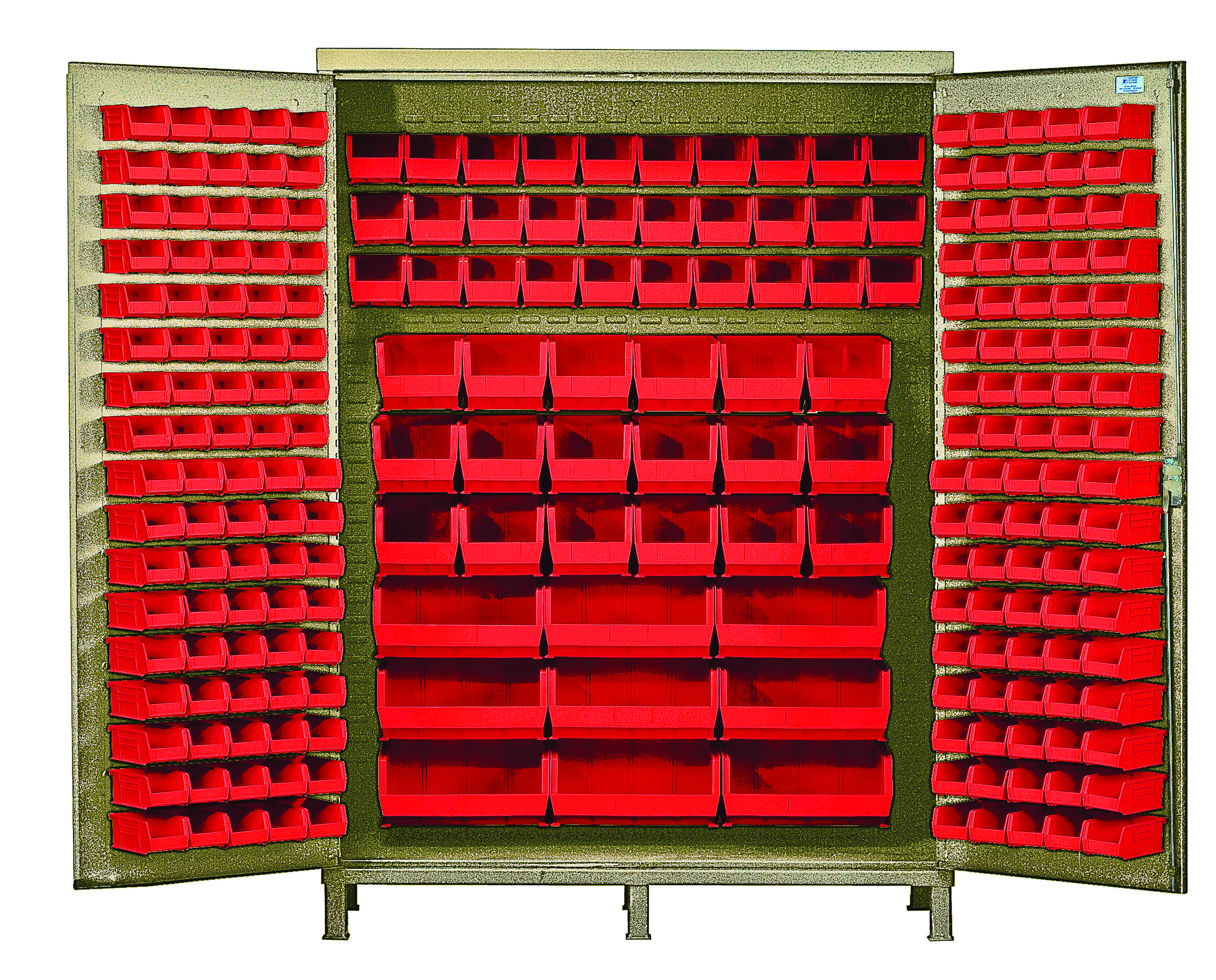 -58%Heavy-Duty 60″ Bin Cabinet, 60″W x 24″D x 84″H, 14 gauge all welded construction, includes: (80) QUS210, (90) QUS220, (30) QUS230, (18) QUS240 and (9) QUS250 red bins, beige powder-coated finish