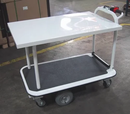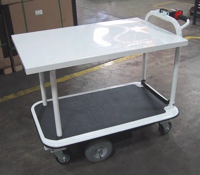 The Electro Kinetic Technologies, Pony Express Motorized Platform Truck, eliminates employee injuries caused by excessive push/pull forces found in manual carts. The cart features a 1,500 pound payload capacity, (2) 26” wide x 49” long shelving units, heavy duty powder coated white steel welded frame, deep cycle AGM rechargeable batteries, on board UL, cUL listed 120/240 VAC battery charger, foam filled never flat drive tires, solid state regenerative braking and holding brake to maintain positon on inclines, non-skid platform surface and curved platform corners with full wrap around vinyl bumpers to protect the cart and surrounds.