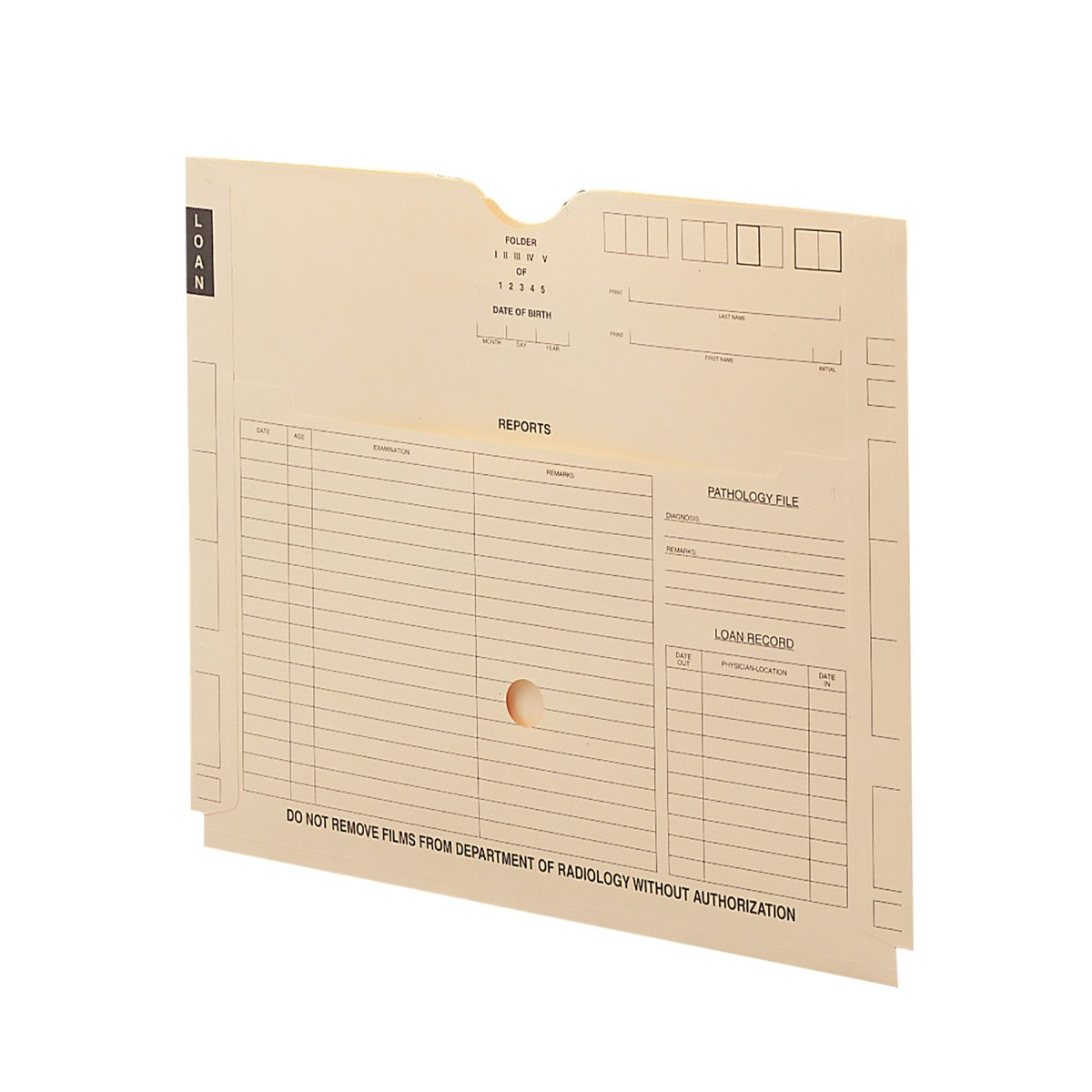 A low-cut front panel and full-height interior divider create a ?kangaroo?-style pocket for storing patient reports in addition to the X-rays or charts in the main pocket. Printed on one side.