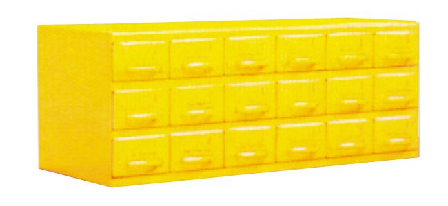 Cabinets of Small Parts Drawers — Equipto Cabinet 12″D x 34-1/8″W x 13-5/8″ H with (18) 3-1/8″H drawers rugged drawers glide smoothly and evenly with just a fingertip effort. With the added convenience of 2 dividers (each divided into 3 compartments ) for storing a variety of small parts. 18″D x 34-1/8″W x 13-5/8″ H Cabinet with 18 drawers