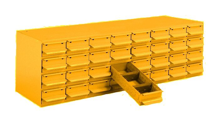 Cabinets of Small Parts Drawers — Equipto Cabinet 12″D x 34-1/8″W x 10-5/8″ H with (32) 2″H rugged drawers glide smoothly and evenly with just a fingertip effort. With the added convenience of 2 dividers (each divided into 3 compartments ) for storing a variety of small parts. 12″D x 34-1/8″W x 10-5/8″ H Cabinet with 32 drawers