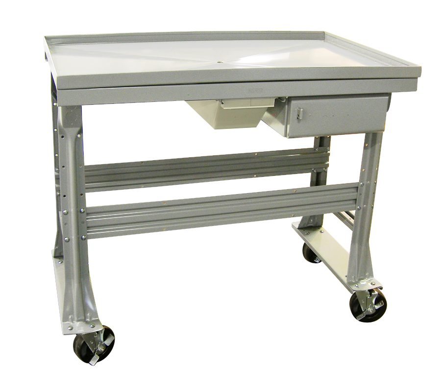 Teardown Bench — Tear Down Bench 30 X 60 X 33.5Drain Top w/34″ High LegTeardown Bench : Design Benefits and Features – ideal for working on transmissions, small engines and hydraulic components, reinforced work surface, top has a 3/4″ high retaining lip on all sides tapering to the rear center to a 1/2″ threaded and plumbed drain; option caster kits contains four swivel 7 1/2″ casters; 1/2″ threaded drain nipple allows for connection of a hose to divert fluid to a storage container or capture fluid with an optional fluid container kit