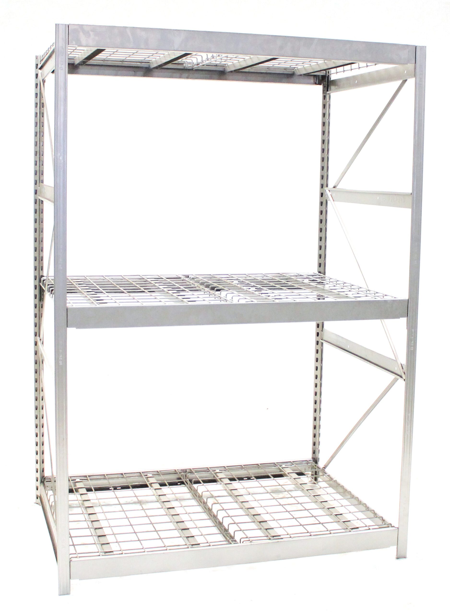 Wire Bulk Rack — Equipto V-Grip Bulk Rack with Wire Decking : V-Grip Bulk Rack is designed to accommodate longer spans and heavier loads than conventional shelving. Bulk Rack beams engage V-Grip upright posts providing a rigid connection. Bulk Rack is designed to carry loads of 1500 lbs per level. Bulk Rack is available three ways – with a solid steel deck, wire decking or without decking to permit the customer to use his own material. Bulk Rack also comes in a starter kit (which both ends) or an add-on unit to be connected to another rack unit.VG Wire Rack-7Hx8Wx4D ADD ON 4 x 8 x 7 High